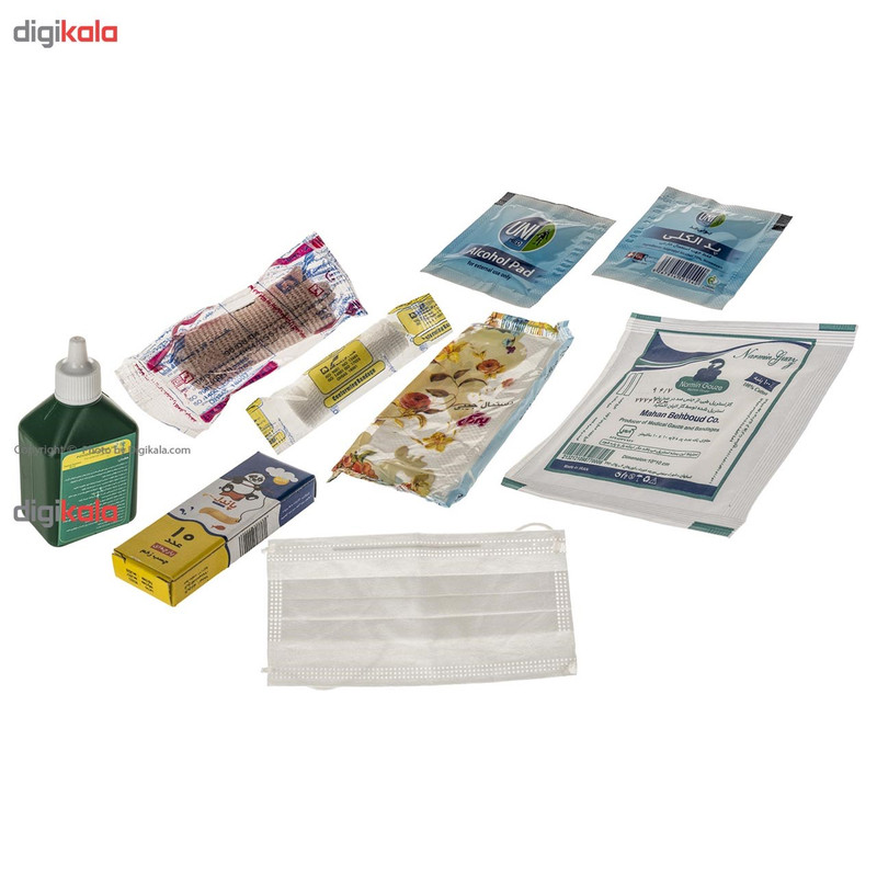 محتویات جعبه کمکهای اولیه: ماسک , چسب زخم , گاز استریل , بتادین , باند کشی , پد الکلی , پانسمان آماده , دستمال کاغذی