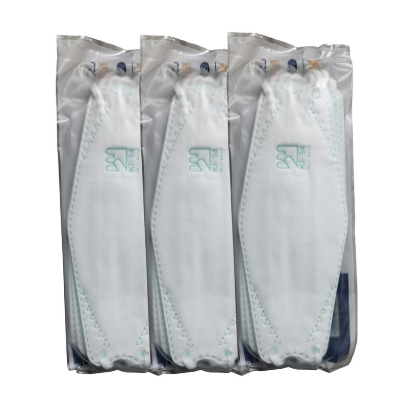 بسته بندی سلفونی طرح دار اصلی شرکت فست ماسک رنگ محصول سفید با لایه داخلی سبز کم رنگ کش های پهن و راحت تعداد 30 عددی