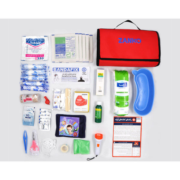 محتویات جعبه کمکهای اولیه: گاز استریل , باند کشی , باند دور بافت , بتادین , پد الکلی , پنبه , دستکش , چسب حلقه ای , کمپرس یخ , قیچی , پنس , سنجاق قفلی , چراغ قوه , ماسک , سوت , سرجی فیکس سر , چسب زخم , گاز وازلینه