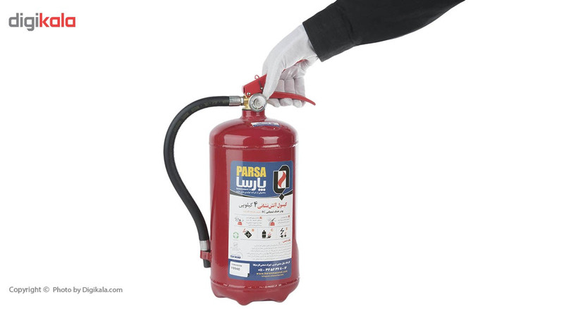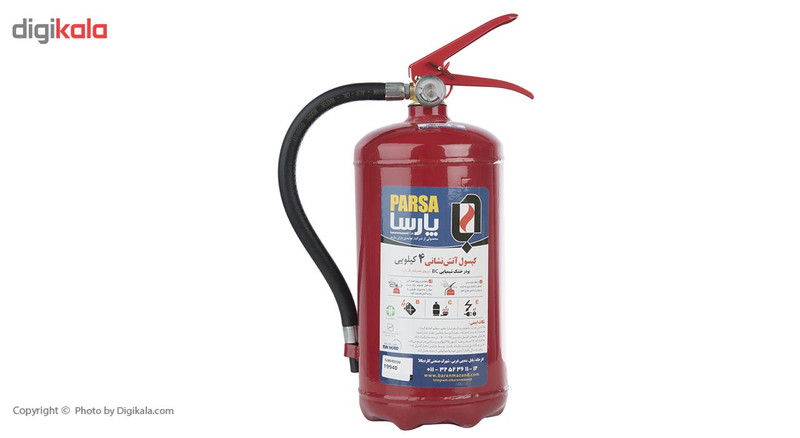 کپسول آتشنشانی فوق یکی از محصولات تولیدی شرکت «پارسا» (Parsa) است. در این کپسول آتشنشانی برای خاموشکردن آتش از پودر خشک BC استفاده شده است. وزن پودر داخل این کپسول 4 کیلوگرم بوده و وزن کل محصول حدود 5.8 کیلوگرم است. در این کپسول آتشنشانی از گاز ازت بهعنوان نیروی محرکه استفاده شده است تا پودر تحت فشار بالا به بیرون پرتاب شود. فشار کاری این محصول 25 کیلوگرم بر سانتیمتر مربع است. در قسمت نازل کپسول فوق از شلنگ استفاده شده است تا کاربر بهراحتی بتواند پودر را روی محل موردنظر پرتاب کند. این کپسول دارای فشارسنج است تا بتوان از میزان فشار داخل آن باخبر شد و در صورت نیاز آن را شارژ کرد. براساس گفتهی شرکت سازنده، این کپسول آتشنشانی را میتوان در دمای منفی 15 تا مثبت 50 درجهی سانتیگراد نگهداری کرد. محصول فوق موفق به اخذ استاندارد ISO9001:2008 شده است.