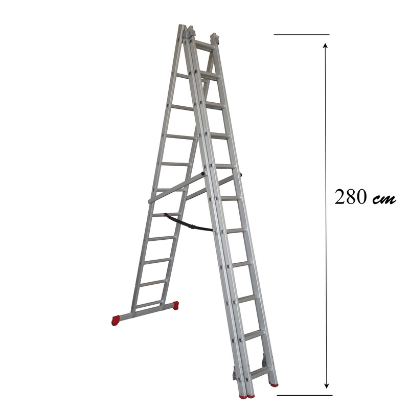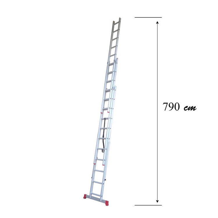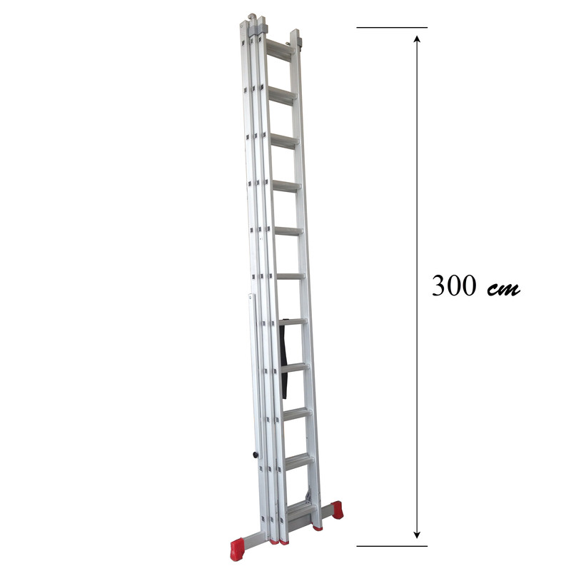 نردبان 9 متری سه لنگه دوطرفه کشویی (مخابراتی). وزن قابل تحمل نردبان 150 کیلوگرم و مجاز 130 کیلو می باشد، قابل تبدیل به چهار حالت مختلف، شامل سه نردبان 3 متری مجزا ، ارتفاع در حالت باز شده کامل هر سه لنگه به صورت کشویی 7.90 متر ، در حالت دو طرفه ( λ ) 4.90 متر ، در حالت دو طرفه ساده 2.80 متر و در حالت بسته یا تکی 3 متر می باشد. این نردبان مناسب سوله و سالن های صنعتی و ورزشی و مساجد و تالار و مجتمع های اداری و تجاری می باشد. ، در ساخت این نردبان از پروفیل های مستحکم اکسترود شده، بدون خط اتصال از جنس آلیاژ مخصوص آلومینیوم استفاده شده است و نفوذ عمیق پله ها در پروفیل های جانبی و پرس محکم انتهای پله ها موجب اتصال امن آنها گردیده است و به علت نوع آلیاژ استفاده شده، موجب استحکام بالا و وزن کم نردبان گردیده است. ، قابلیت بالای حفظ تعادل به علت استفاده از پایه پهن و لاستیک های مخصوص ضد لغزش در پایه نردبان و دستک های نگهدارنده و کمربند ایمنی و سطح مقطع مربع شکل موجب استحکام بیشتر پـله ها و ایمنی بالای نردبان شده و همچنین راحتی هر چه بیشتر را برای کاربران محترم تامین کرده است. ، به دلیل کیفیت بالای آلیاژ به کار رفته در پروفیل ها، از رنگ کردن محصولات اجتناب می کنیم و احتمال وجود خط و خش جزئی بر روی محصولات می باشد که در نردبان های آلومینیومی کاملاً طبیعی است. ، شاید در نگاه اول نردبان به صورت یک ابزار ساده به نظر برسد ولی یکی از پر اهمیت ترین نکاتش تامین امنیت و راحتی کاربر می باشد که به حول قوه الهی نزدیک به نیم قرن تامین کننده صد در صد امنیت و ایمنی کاربرانمان بوده ایم و هستیم. ، صنایع آلوپات نخستین تولید کننده ایرانی است که نردبان و بالابر و داربست هایی با کیفیت برتر در انواع صنعتی و خانگی و فوق مستحکم نیروگاهی و آتش نشانی با استانداردهای پذیرفته شده بین المللی را طراحی و تولید کرده است و دارای استاندارد ایران و ISO 9001:2015 در سیستم مدیریت کیفیت، صادره از رویال سرت ( Royal Cert ) آلمان می باشد و محصولات این شرکت با رعایت آخرین استانداردهای بین المللی در این زمینه تولید می گردد.