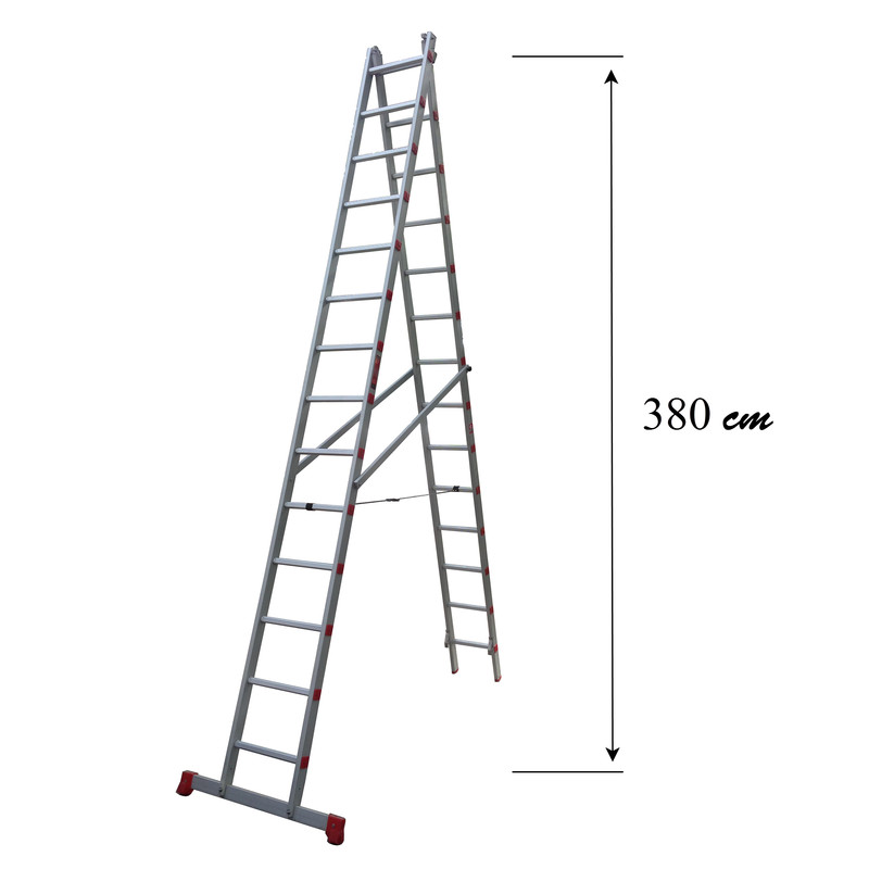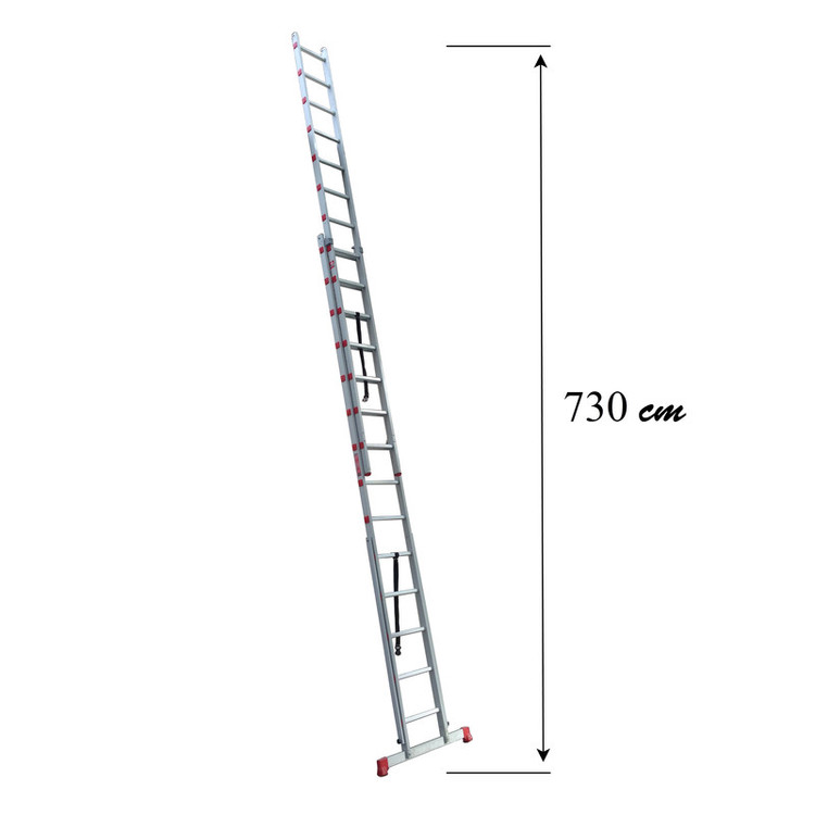 نردبان 8 متری دولنگه دوطرفه کشویی (مخابراتی) . وزن قابل تحمل نردبان 150 کیلوگرم و مجاز 120 کیلوگرم ، قابل تبدیل به سه حالت مختلف، شامل دو لنگه 4 متری مجزا ، ارتفاع در حالت باز شده کامل هر دو لنگه به صورت کشویی 7.3 متر ، در حالت دو طرفه 3.80 متر و در حالت بسته 4 متر می باشد. این نردبان مناسب سوله و سالن های صنعتی و ورزشی و مساجد و تالار و مجتمع های اداری و تجاری می باشد. در ساخت این نردبان از پروفیل های مستحکم اکسترود شده و بدون خط اتصال از جنس آلیاژ مخصوص آلومینیوم استفاده شده است و نفوذ عمیق پله ها در پروفیل های جانبی و پرس محکم انتهای پله ها موجب اتصال امن آنها گردیده است و به علت نوع آلیاژ استفاده شده، موجب استحکام بالا و وزن کم نردبان گردیده است. قابلیت بالای حفظ تعادل به علت استفاده از پایه پهن و لاستیک های مخصوص ضد لغزش در پایه های نردبان و دستکهای نگهدارنده و کمربند ایمنی و سطح مقطع مربع شکل موجب استحکام بیشتر پـله ها و ایمنی بالا شده و همچنین راحتی هر چه بیشتر را برای کاربران محترم تامین کرده است. ، به دلیل کیفیت بالای آلیاژ به کار رفته در پروفیل ها، از رنگ کردن محصولات اجتناب می کنیم و احتمال وجود خط و خش جزئی بر روی محصولات می باشد. شاید در نگاه اول نردبان به صورت یک ابزار ساده به نظر برسد ولی یکی از پر اهمیت ترین نکاتش تامین امنیت و راحتی کاربر می باشد که به حول قوه الهی نزدیک به نیم قرن تامین کننده صد در صد امنیت و ایمنی کاربرانمان بوده ایم و هستیم. ، صنایع آلوپات نخستین تولید کننده ایرانی است که نردبان ها و بالابرهایی با کیفیت برتر در انواع صنعتی و خانگی و فوق مستحکم نیروگاهی و آتش نشانی با استانداردهای پذیرفته شده بین المللی را طراحی و تولید کرده است و دارای استاندارد ایران و ISO 9001:2015 در سیستم مدیریت کیفیت، صادره از رویال سرت ( Royal Cert ) آلمان می باشد و محصولات این شرکت با رعایت آخرین استانداردهای بین المللی در این زمینه تولید می گردد.