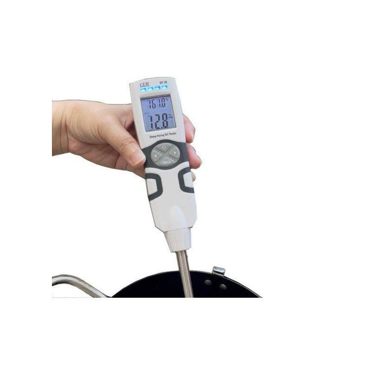 تستر روغن خوارکی دیجیتال سی ای ام مدل CEM DT-70 یک دستگاه کاربردی و موثر جهت اندازه گیری دمای روغن سرخ کردنی و مقدار TPM (مقدار کل مواد قطبی) می باشد. مقدار TPM نشان دهنده وضعیت کیفی و سلامتی روغن سرخ کردنی می باشد که بسته به دمای آن و مدت زمانی که روغن حرارت دیده است سنجیده می شود. این دستگاه می تواند دمای روغن سرخ کردنی را در رنج 40 تا 200 درجه سانتی گراد (104 تا 392 درجه فارنهایت) با رزولوشن 0.1 درجه سانتی گراد و دقت 1.5 درجه سانتی گراد و مقدار TPM روغن را در رنج 0 تا 40% با رزولوشن 0.5% و دقت 2% اندازه گیری کند. از دیگر ویژگی های تستر کیفیت روغن سرخ کردنی سی ای ام CEM DT-70 می توان به نشانگر هشدار LED، عمر مفید 25 ساعته باتری (که به طور تقریبی برای 500 اندازه گیری مناسب می باشد)، این دستگاه سرعت پاسخگویی کمتر از 30 ثانیه برای اندازه گیری مقدار TPM و برخورداری از تاییدیه IP68 (مقاومت کامل در برابر نفوذ آب و گرد و غبار به داخلی دستگاه) اشاره کرد.