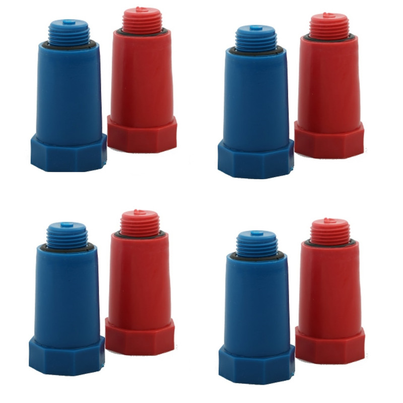 بسته 8 عددی ( 4 عدد قرمز - 4 عدد آبی ) درپوش پایه بلند رزوه ای پلیمری سایز 1/2 اینچ / دارای اورینگ آب بندی / بدون نیاز به تفلون پیچی
