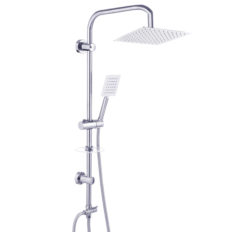 سه راه با کیفیت، شلنگ استیل ریز بافت، گوشی و سردوش استیل، جاصابونی، پایه های با پوشش نیکل کروم، آسانسوری دکمه ای قابل تنظیم، شلنگ رابط دوش، لوله استیل، واشر های اب بندی و پیچ و رول پلاک جهت نصب.