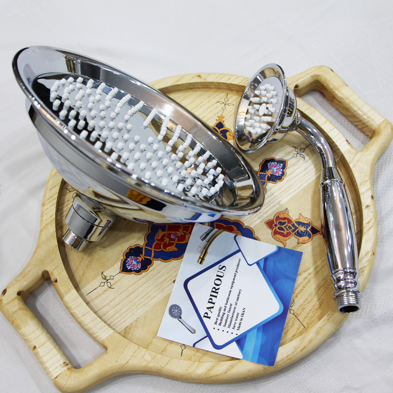 مجهز به منافذ پلیمری که رسوب زدایی را راحت میکند، تعداد زیاد نازل اب جهت پخش مناسب آب، دارای جاصابونی، شلنگ استیل ریزبافت، قابلیت تنظیم ارتفاع گوشی، دارای پیچ و رول پلاک برای نصب