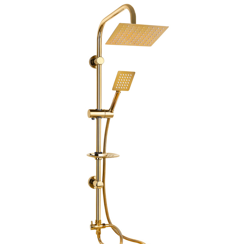 سه راه با کیفیت، شلنگ استیل ریز بافت، گوشی و سردوش استیل، جاصابونی، پایه های با پوشش تحت خلا طلایی، آسانسوری دکمه ای قابل تنظیم، شلنگ رابط دوش، لوله استیل، واشر های اب بندی و پیچ و رول پلاک جهت نصب.