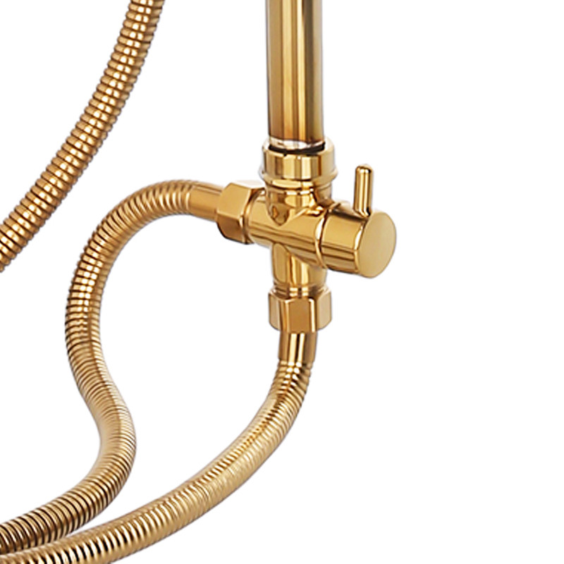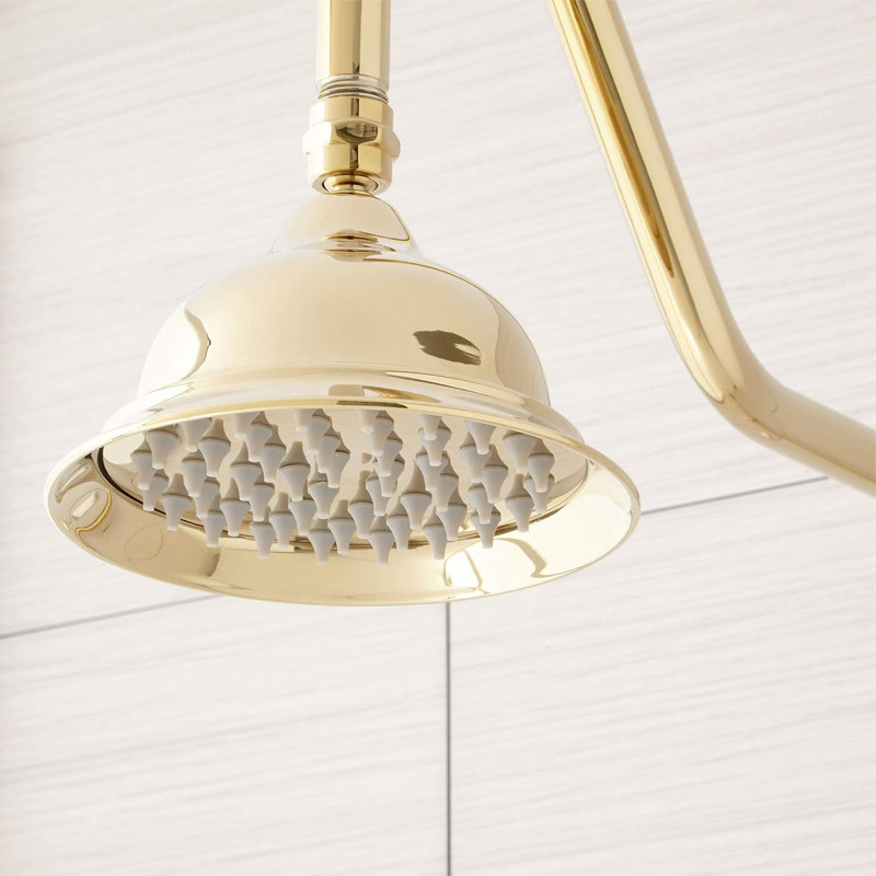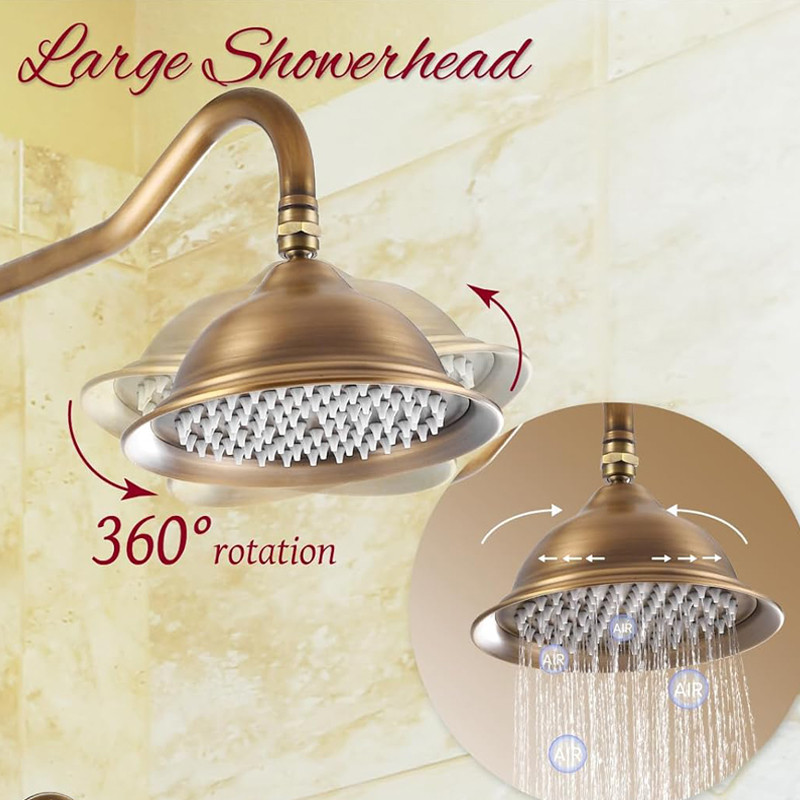 سه راه با کیفیت، شلنگ استیل ریز بافت، گوشی و سردوش شیپوری، جاصابونی، پایه های با پوشش طلایی، آسانسوری دکمه ای قابل تنظیم، شلنگ رابط دوش، لوله استیل، واشر های اب بندی و پیچ و رول پلاک جهت نصب.