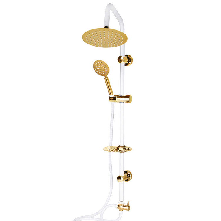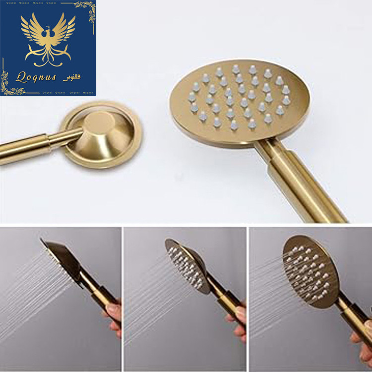 سه راه با کیفیت، شلنگ استیل ریز بافت، گوشی و سردوش استیل، جاصابونی، پایه های با پوشش تحت خلا طلایی، آسانسوری دکمه ای قابل تنظیم، شلنگ رابط دوش، لوله استیل، واشر های اب بندی و پیچ و رول پلاک جهت نصب.