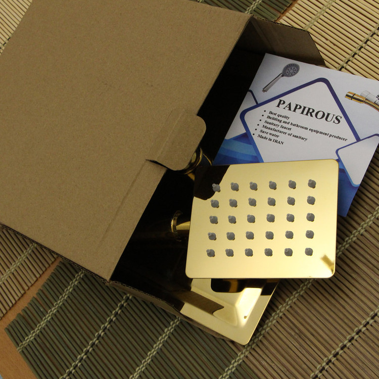 جنس استیل ضد زنگ، پوشش طلایی تحت خلا، دارای واشر توری دار جهت حذف رسوبات آب، سایز اتصالات استاندارد و قابل اتصال به تمامی لوله های دوش و شلنگ دوش استاندارد. مجهز به نازل های سیلیکونی، تعداد زیاد نازل اب جهت پخش مناسب آب،