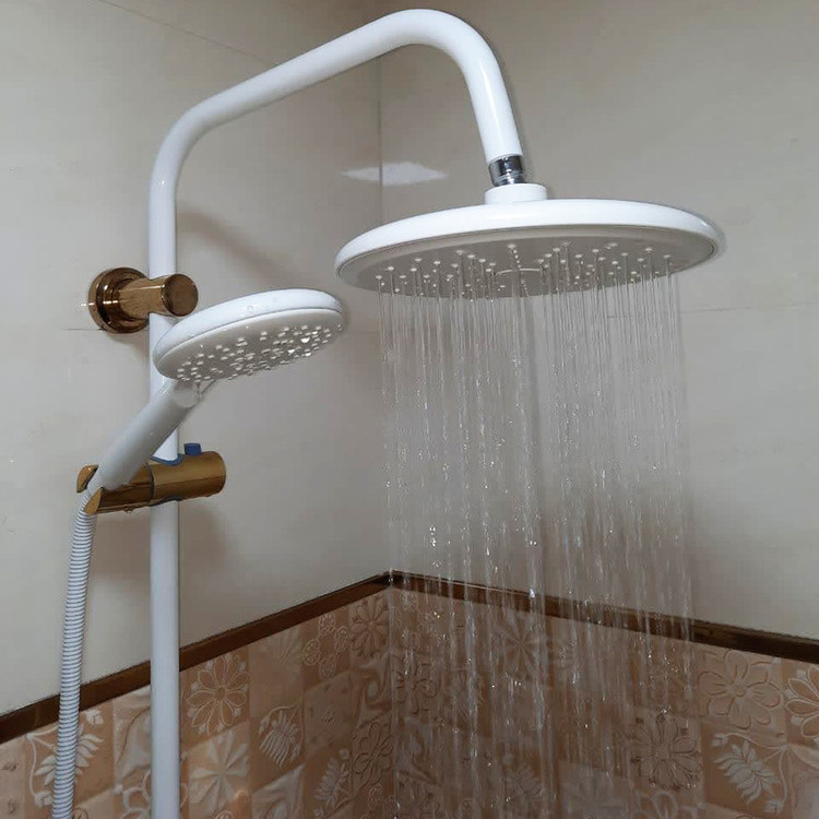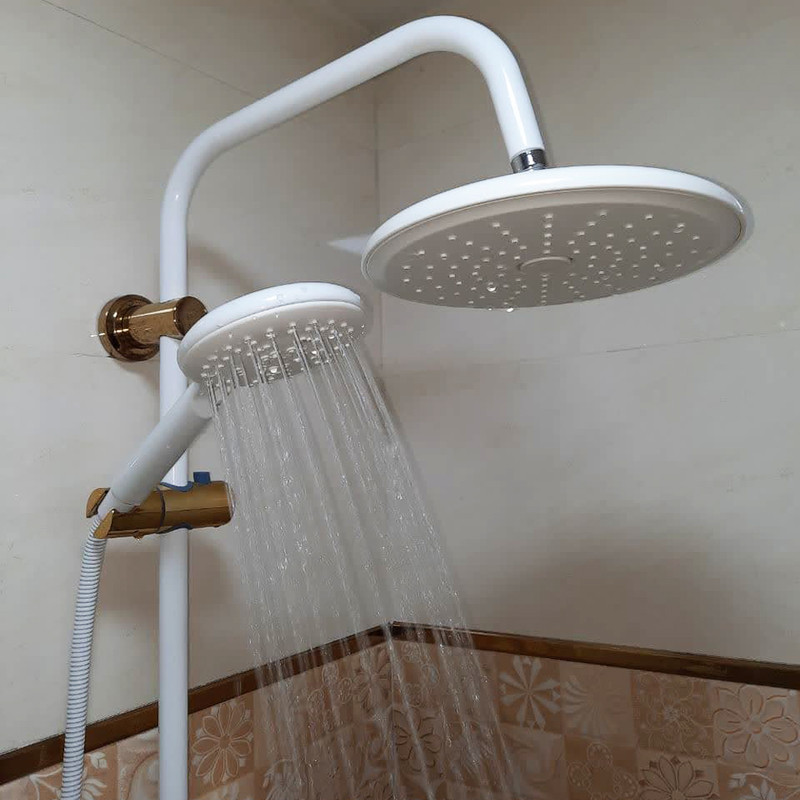سه راه با کیفیت، شلنگ استیل ریز بافت، گوشی و سردوش مجهز به حالت رسوبگیری، جاصابونی، پایه ها، آسانسوری دکمه ای قابل تنظیم، شلنگ رابط دوش، لوله استیل، واشر های اب بندی و پیچ و رول پلاک جهت نصب.