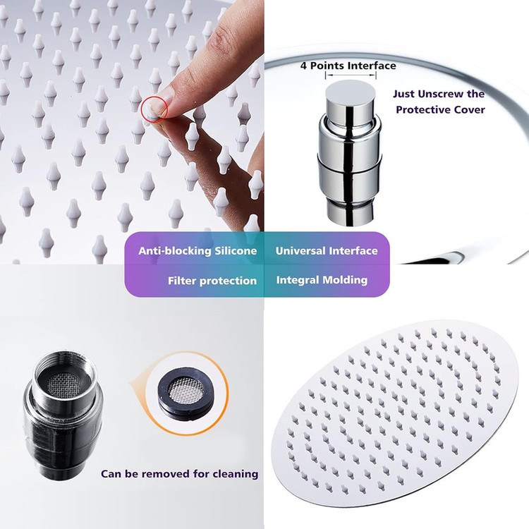 جنس استیل ضد زنگ، دارای واشر توری دار جهت حذف رسوبات آب، سایز اتصالات استاندارد و قابل اتصال به تمامی لوله های دوش و شلنگ دوش استاندارد. مجهز به نازل های سیلیکونی، تعداد زیاد نازل اب جهت پخش مناسب آب، نصب راحت