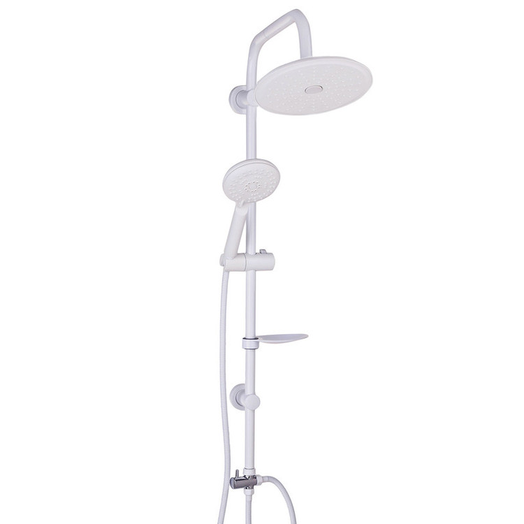 سه راه با کیفیت، شلنگ استیل ریز بافت، گوشی و سردوش مجهز به حالت رسوبگیری، جاصابونی، پایه ها، آسانسوری دکمه ای قابل تنظیم، شلنگ رابط دوش، لوله استیل، واشر های اب بندی و پیچ و رول پلاک جهت نصب.