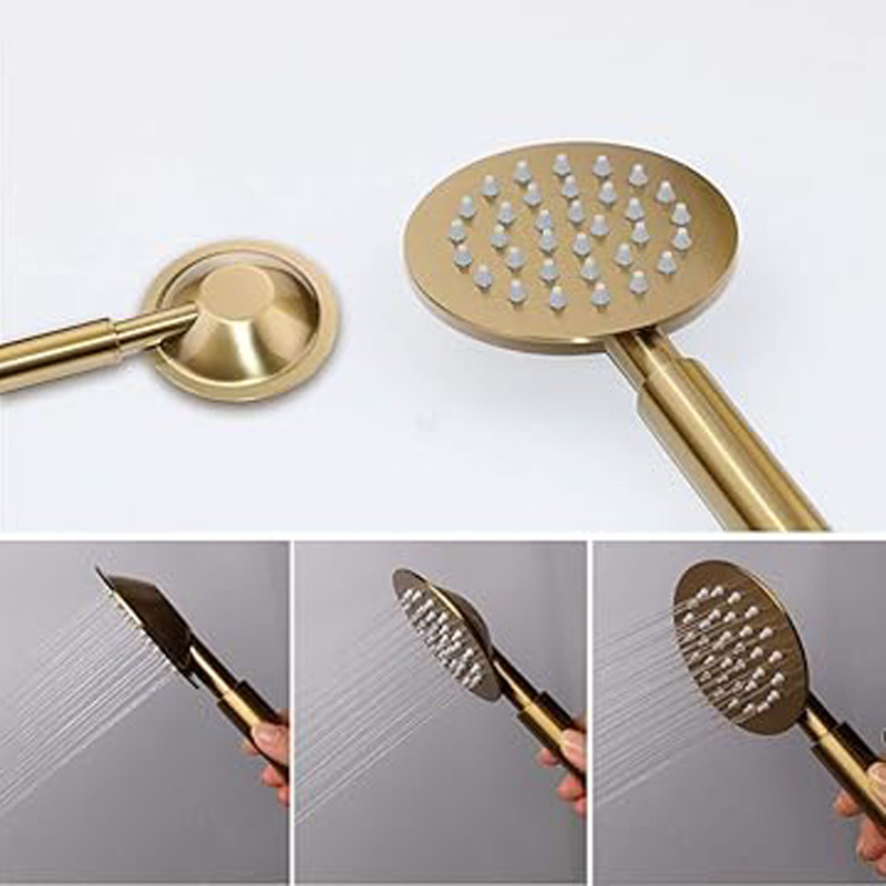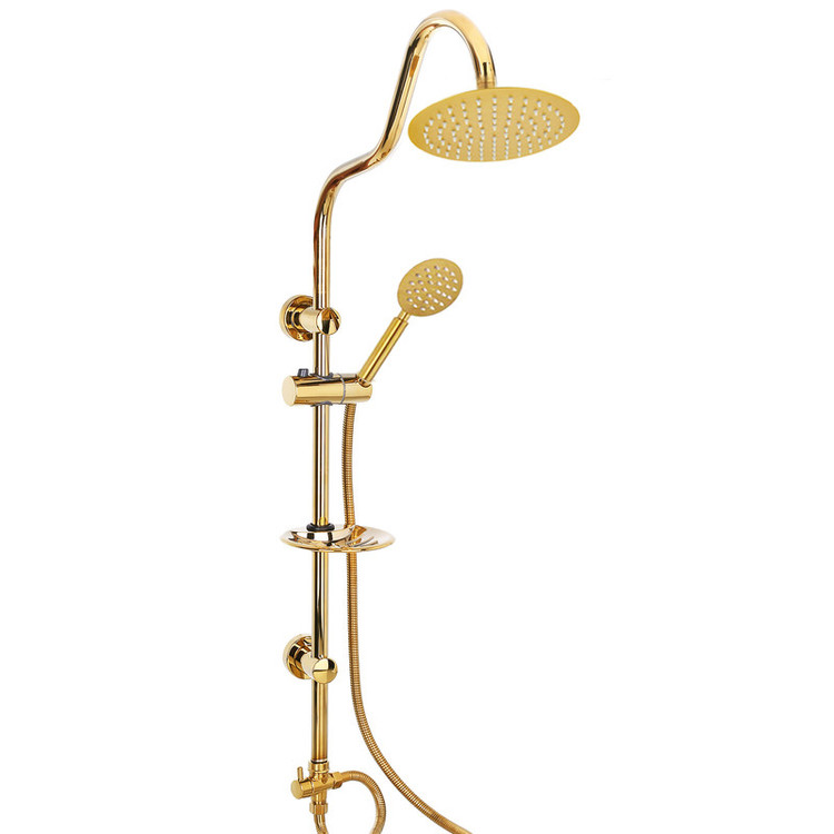 سه راه با کیفیت، شلنگ استیل ریز بافت، گوشی و سردوش استیل، جاصابونی، پایه های با پوشش تحت خلا طلایی، آسانسوری دکمه ای قابل تنظیم، شلنگ رابط دوش، لوله استیل، واشر های اب بندی و پیچ و رول پلاک جهت نصب.