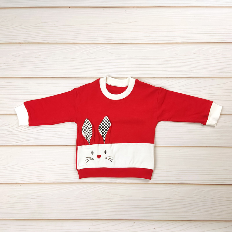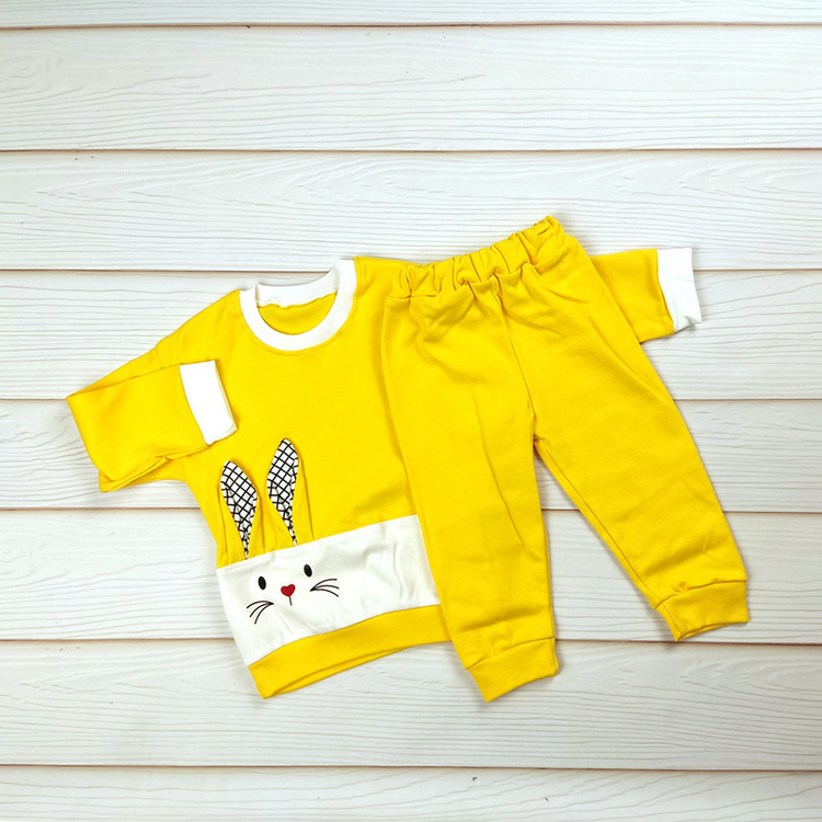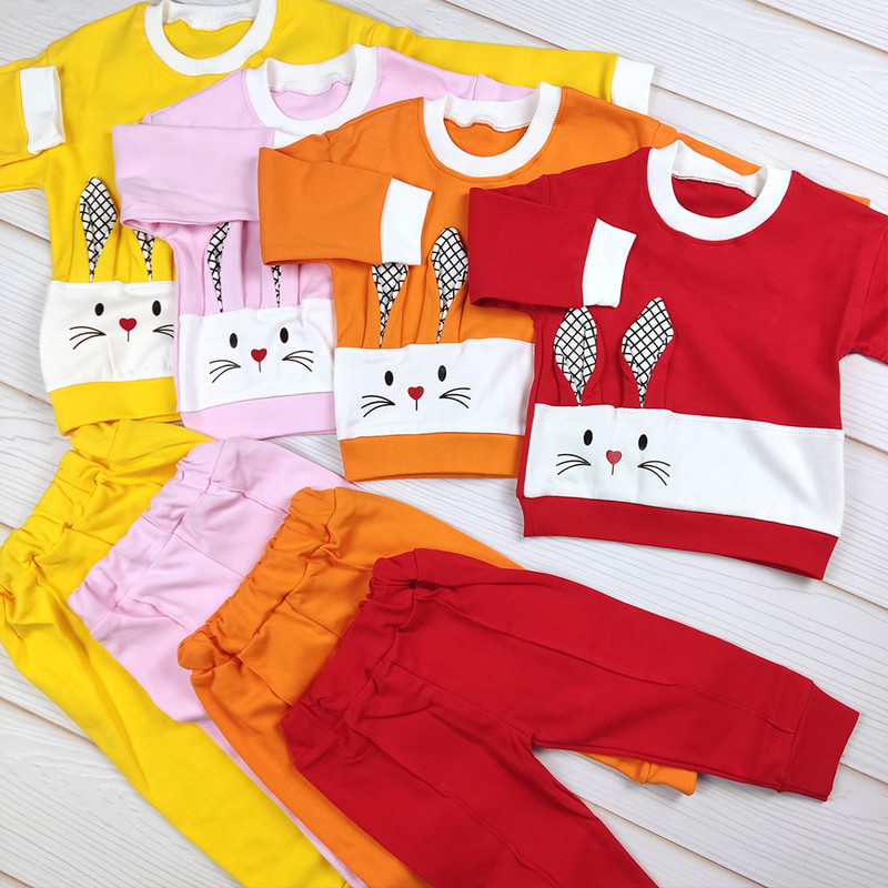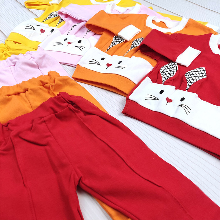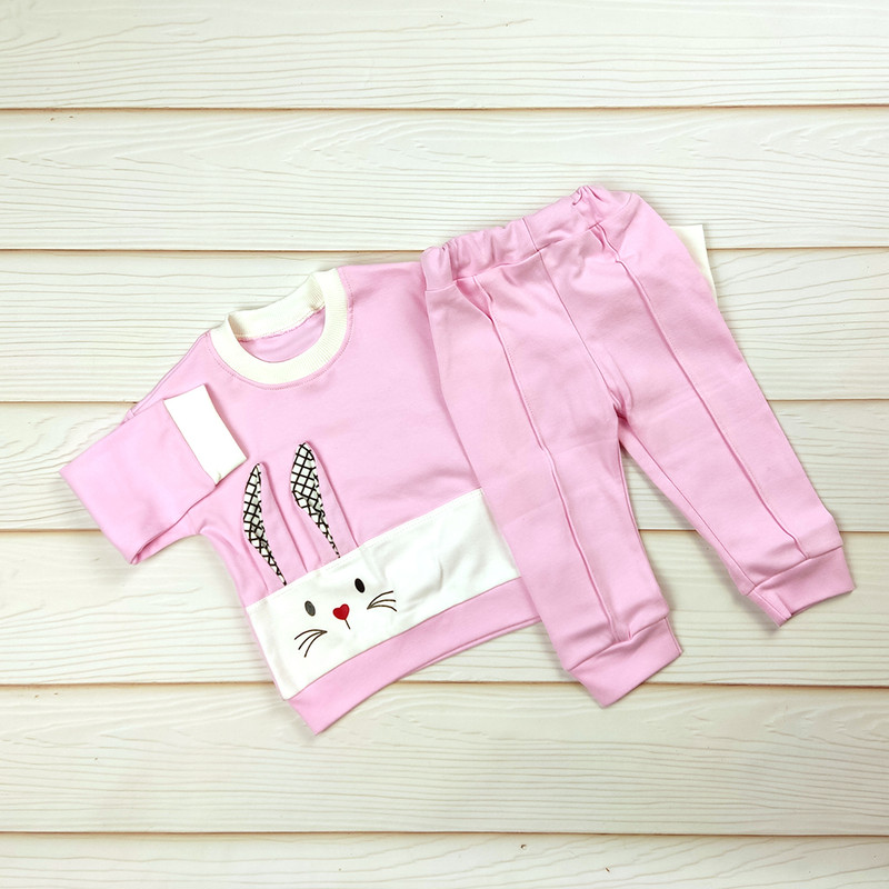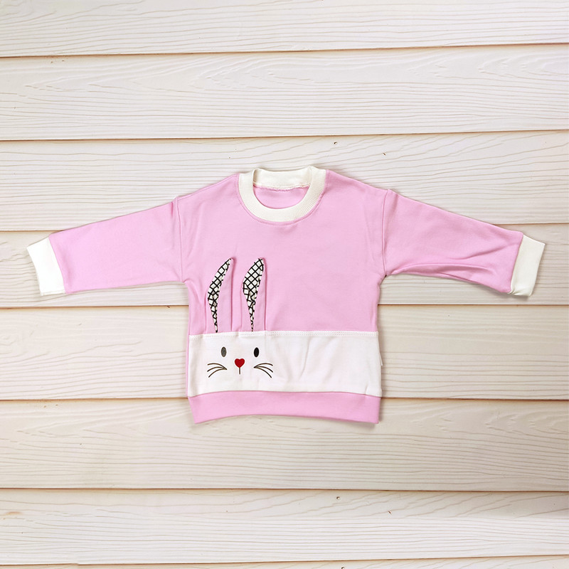 طرح خرگوش فانتزی روی بلوز، یقه و سرآستین ساده، شلوار راحت با کمر کشی و رنگبندی شاد و کودکپسند.