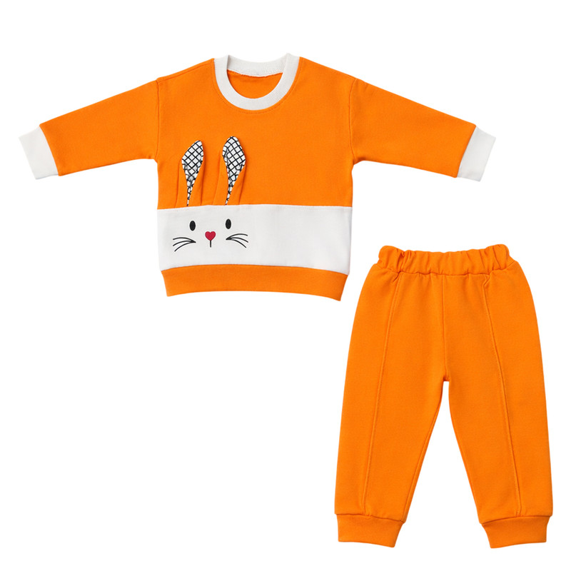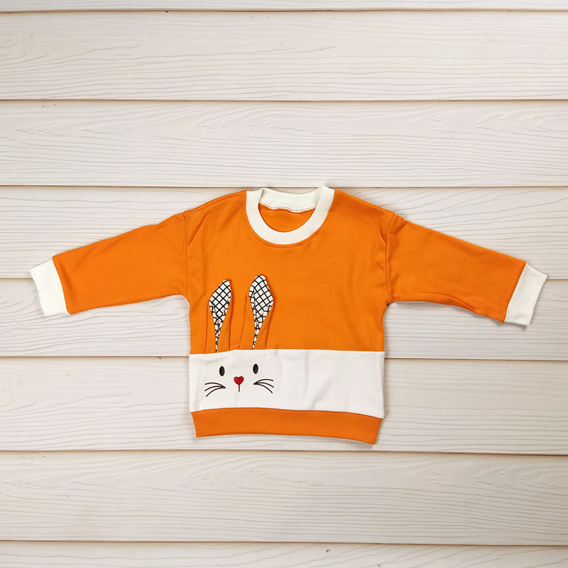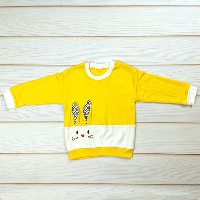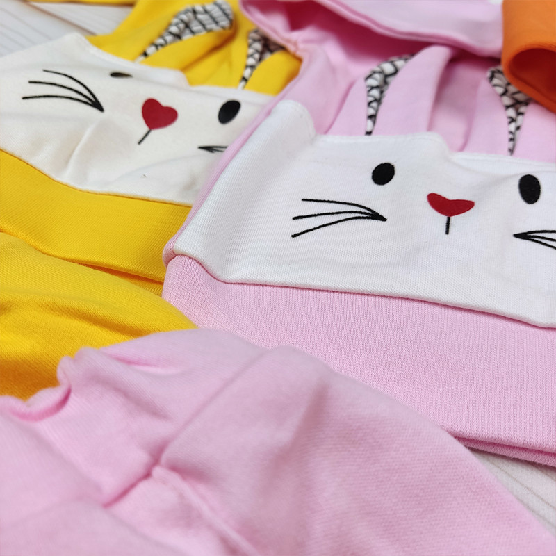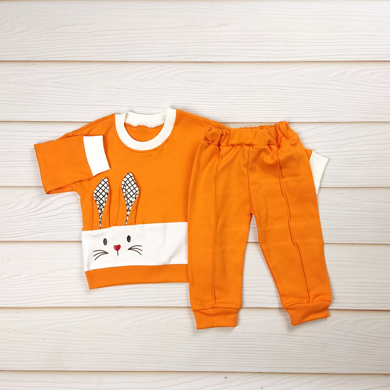 طرح خرگوش فانتزی روی بلوز، یقه و سرآستین ساده، شلوار راحت با کمر کشی و رنگبندی شاد و کودکپسند.