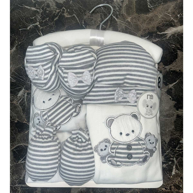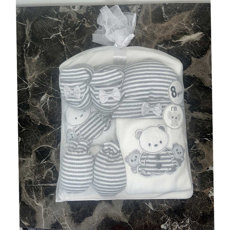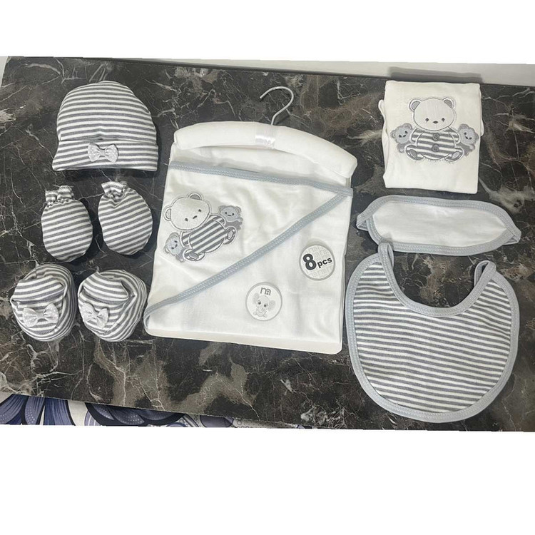 ست بیمارستانی (ست اغازین) 8 تیکه مادرکر شامل: 1چوب لباسی، 2سرهمی، 3دورپیچ، 4کلاه، 5پیشبند، 6دستکش 7پاپوش 8ناف بند