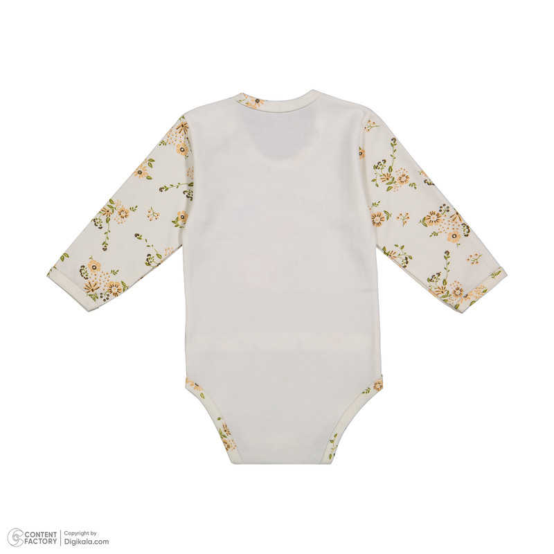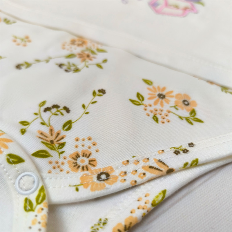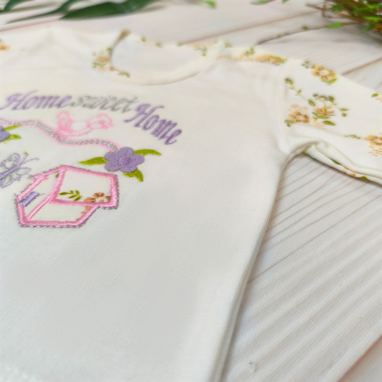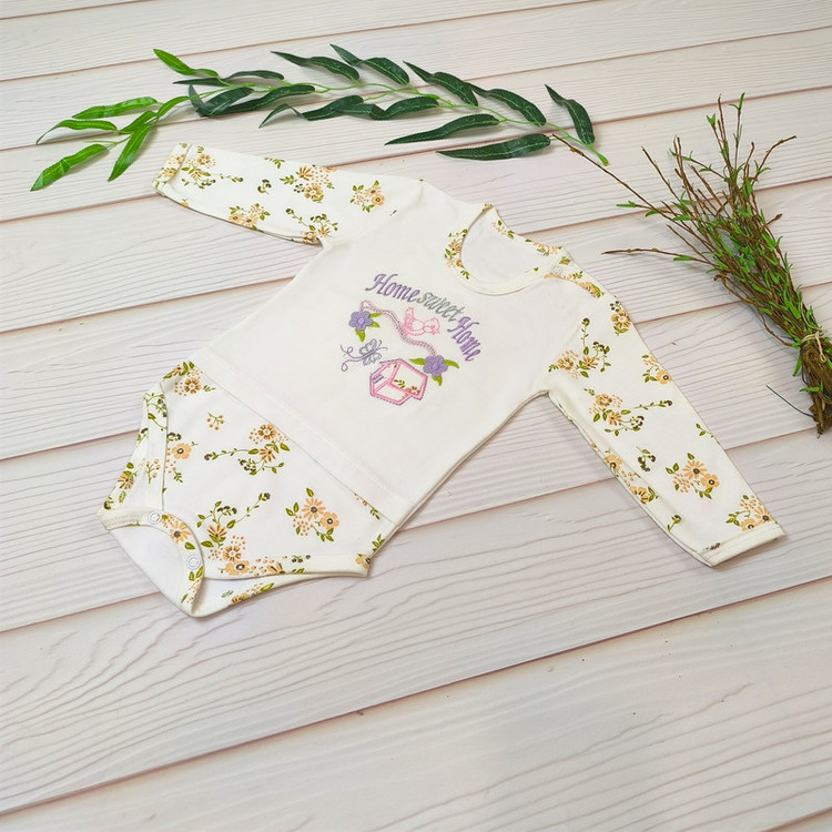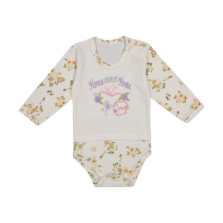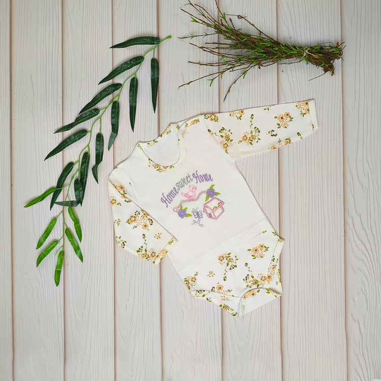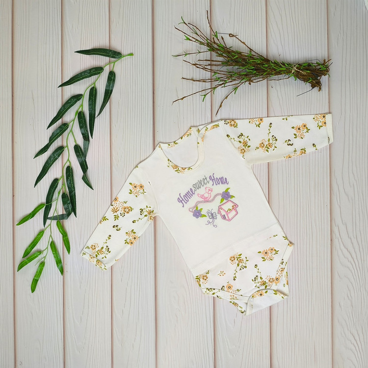 بادی آستین بلند نوزادی دارای یقهی گرد و آستینهای بلند با دکمه های فشاری در بخش زیرین است. پارچه لباس طرح گلدار بوده و قسمت جلویی آن با تصاویر گل و خانه تزیین شده است.