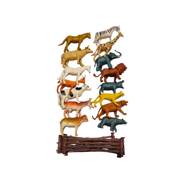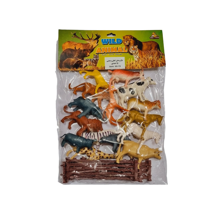 15 عدد فیگور حیوانات اهلی و وحشی همچنین شش نرده پلاستیکی قابل اتصال برای ساخت مزرعه در بسته قرار دارد.