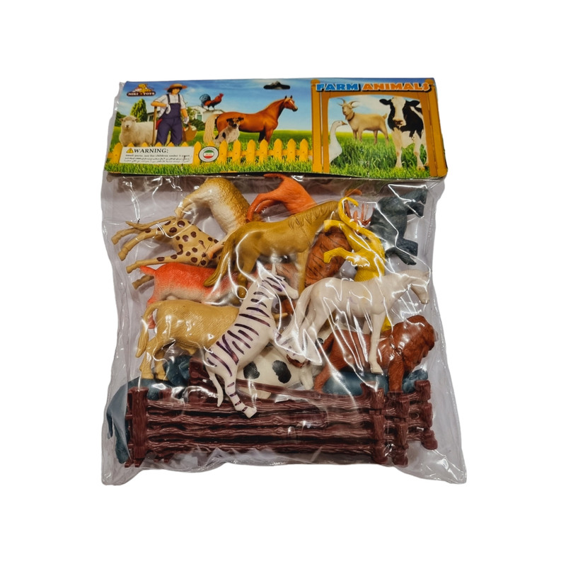 15 عدد فیگور حیوانات اهلی و وحشی همچنین شش نرده پلاستیکی قابل اتصال برای ساخت مزرعه در بسته قرار دارد.