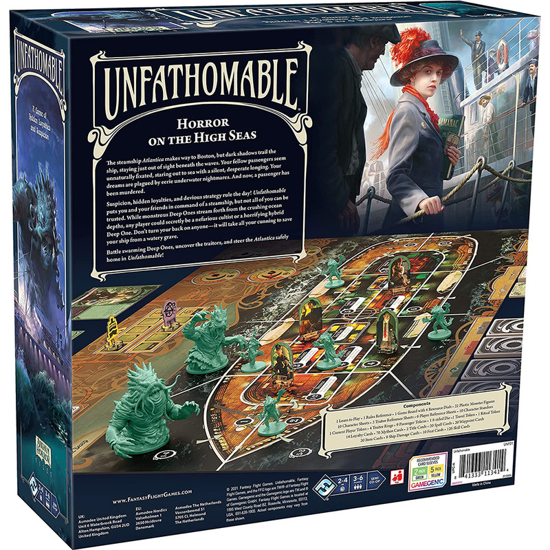 کشتی بخار آتلانتیکا راهی بوستون می شود، اما سایه های تاریکی از کشتی عبور می کنند و درست دور از دید در زیر امواج شناور می شوند. به نظر می رسد مسافران کشتی به طور طبیعی تمرکز ندارند و با اشتیاق خاموش و ناامیدانه به دریا خیره شده اند. رویاهای محققین با کابوس های زیر آب مواجه می شوند. و حالا یک مسافر کشته شده است. سوء ظن، وفاداری پنهان و استراتژی شیطنت آمیز بر روز حاکم است. Unfathomable بازیکنان را در کنترل یک بخار قرار می دهد، اما همه بازیکنان نمی توانند به آن اعتماد کنند. در حالی که هیولاهای Deep Ones از اعماق اقیانوس به سمت جلو حرکت می کنند، هر بازیکنی می تواند مخفیانه یک فرقه شرور یا هیبرید وحشتناک Deep One باشد. محققین باید مراقب باشند که کسی را برگردانند، نجات کشتی خود از شر یک کشتی به تمام حیله گری آنها نیاز دارد. قبر پر آب با Deep One های پرجمعیت مبارزه کنید، خائنان را کشف کنید و آتلانتیکا را با خیال راحت به خانه Unfathomable هدایت کنید.