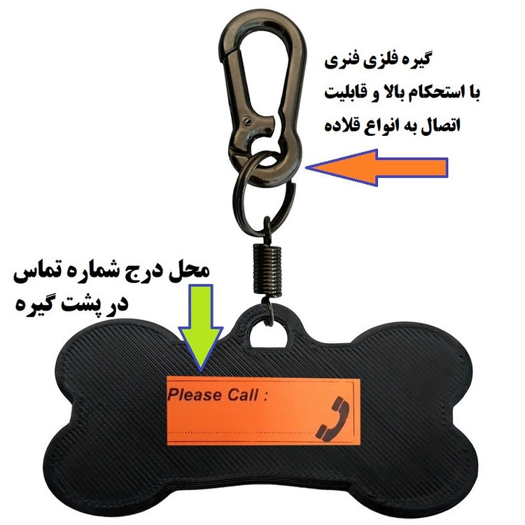 سایر توضیحات: x دارای بدنه پلاستیکی منعطف کاملا بهداشتی و ضد حساسیت با قابلیت شستشو و ضد عفونی x دارای گیره فلزی فنری با استحکام بالا و قابلیت اتصال به انواع قلاده x دارای لیبل مخصوص ثبت شماره تماس مالک حیوان در پشت پلاک