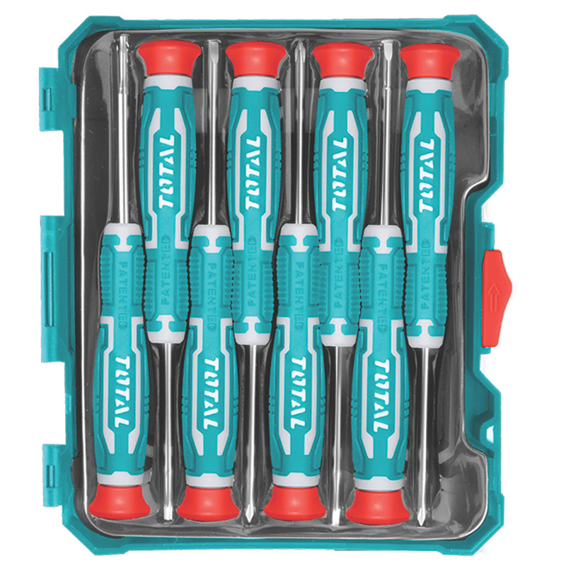 8 عدد پیچ گوشتی ساعتی دوسو ، چهارسو و ستاره ای دسته ارگونومیک و ضدلغزش برند توتال تحت لیسانس آمریکا دارای استاندارد CE اروپا طراحی ارگونومیک و دوام بالا مورد تایید متخصصان ابزار باطن