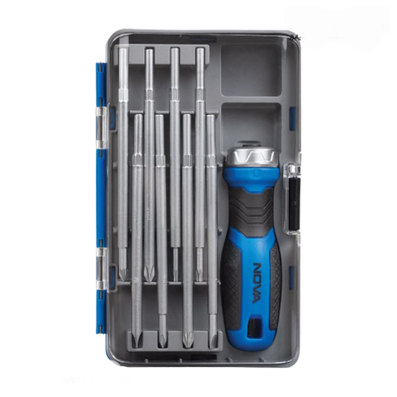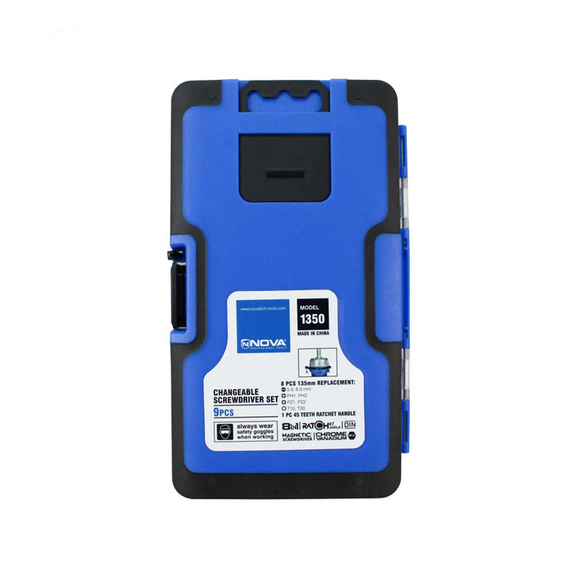 مجموعه 9 عددی پیچ گوشتی جغجغه ای نووا مدل 1350 دارای میله های بلند 135 میلی متری با نوک آهنربایی، ضامن و شفت نگهدارنده از آلیاژ روی، سوکت های تولید شده از بهترین و با کیفیت ترین آلیاژ فولاد، دسته پیچ گوشتی جغجغه ای 45 دندانه با قابلیت تنظیم در سه حالت و همچنین سر پیچ گوشتی هایی از جنس کروم وانادیوم را می توان از ویژگی های مهم این ست پیچگوشتی نام برد.
