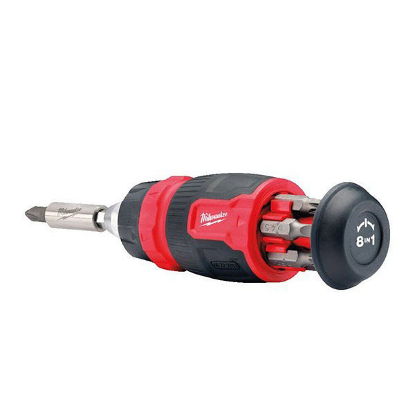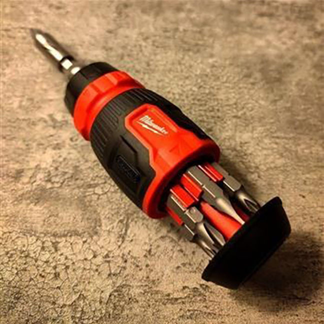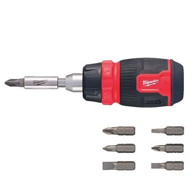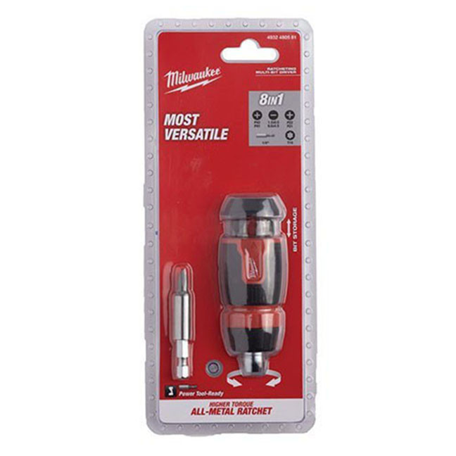 پیچ گوشتی مشتی جغجغه ای میلواکی Milwaukee همراه با یک عدد هولدر بیت و 6 عدد بیت پر مصرف و کاربردی در خشاب انتهای دسته