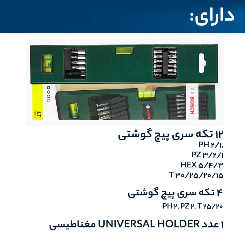 بیت های پیچ گوشتی L = 25 میلی متر: PH 1/2، PZ 1/2/3 H 3/4/5 T 15/20/25/T 30 بیت های پیچ گوشتی L = 50 میلی متر: PH 2 PZ 2 T 20/25.