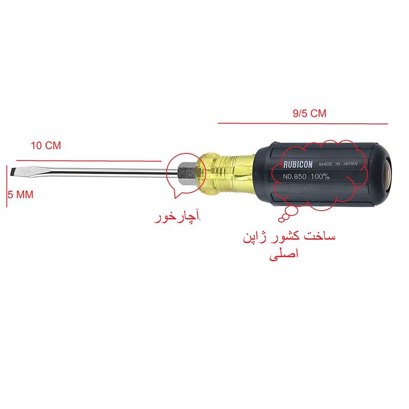 طول پیچگوشتی 19/5 سانتیمتر / طول دسته 9/5سانتیمتر / ضخامت دسته 3 سانتیمتر / طول میله 10 سانتی متر/ پهنای نوک 5 میلیمتر / میله آچار خور /ساخت کشور ژاپن {اصلی }