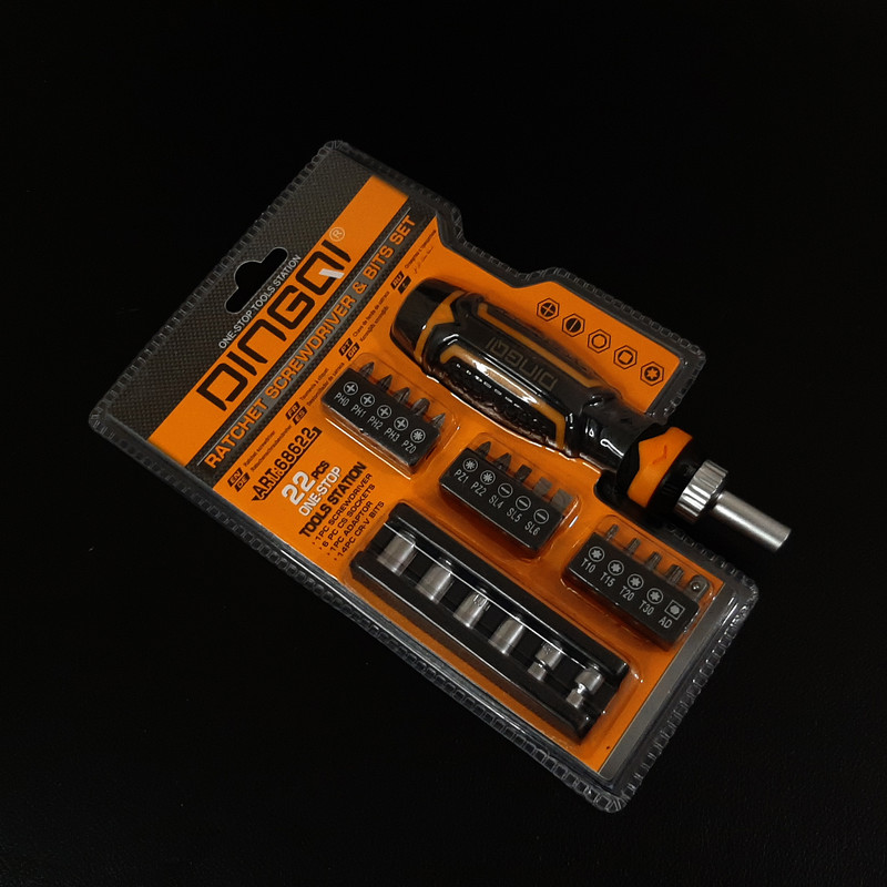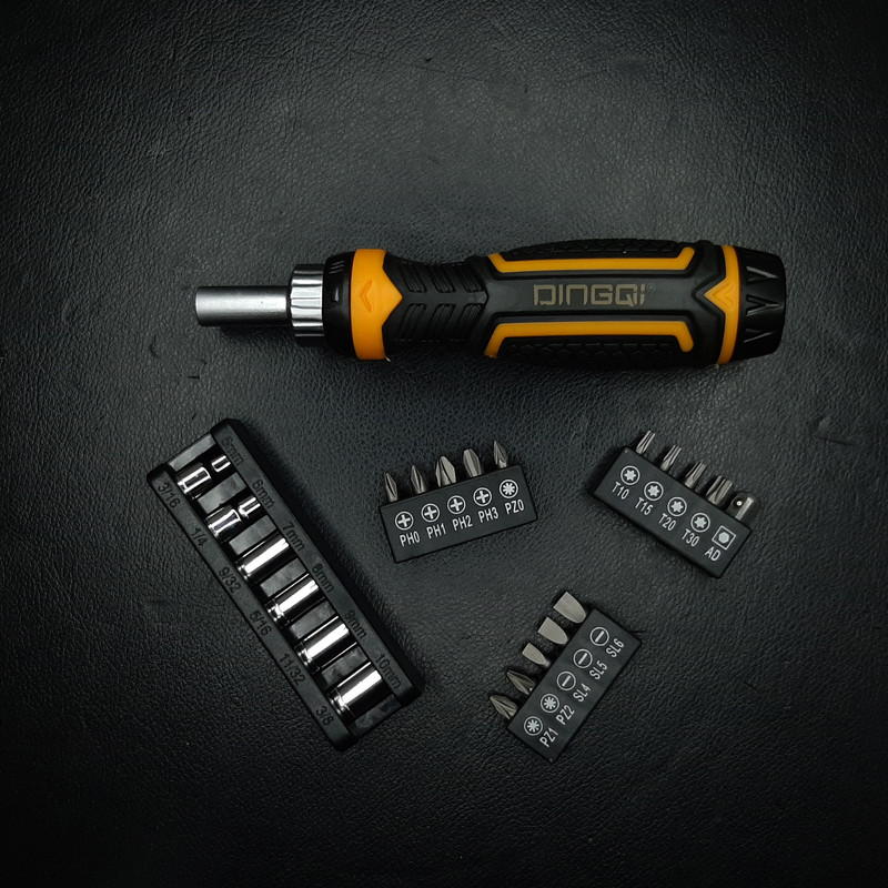 1 عدد دسته جغجغه ای 4 عدد بیت پیچ گوشتی چهارسو 3عدد بیت دوسو 3عدد پیچ گوشتی چهارسو PZ 4 عدد بیت ستاره ای T10-T15-T20-T30 1 عدد تبدیل 1/4 اینچ 6 عدد سری بکس در سایز های 5-6-7-8-9-10 میلی متر