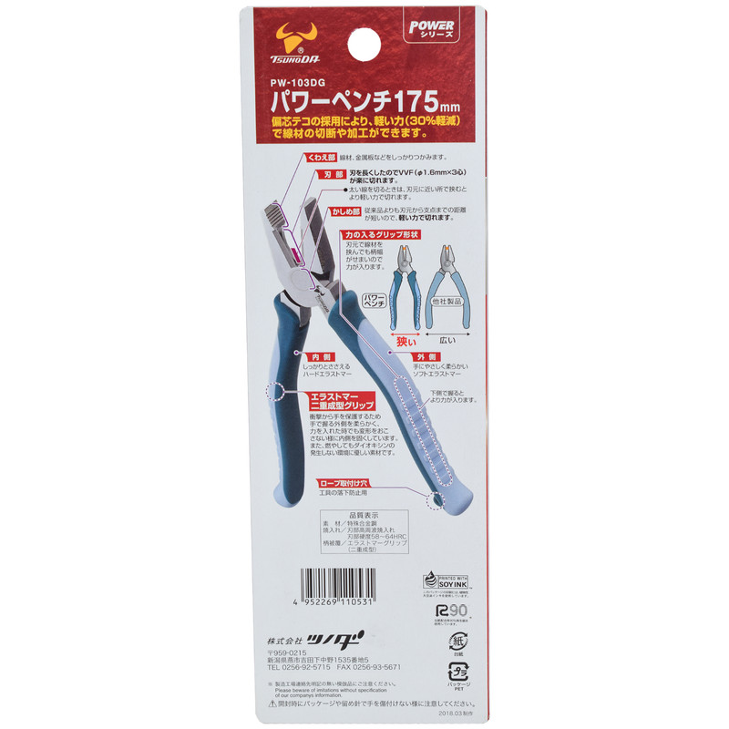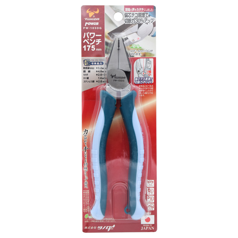سری POWER از محصولات شرکت تسونودا ژاپن می باشد که از کیفیت بی نظیری برخوردار بوده و قابل استفاده برای کارکردی حرفه ای می باشد . فاصله بین تیغه ها و اهرم در این سری کوتاه تر از نمونه های رایج بوده و این ساختار منحصربفرد سبب شده است تا نیروی لازم جهت برش را تا 70درصد کاهش دهد .دسته های این سری از روکش دو گانه منعطف و از مواد رزین ساخته شده است تا ضمن دوام بالا ، کار با آن را برای کاربر لذت بخش نماید . انبردست مدل PW-103DG از محصولات سری پاور تسونودا می باشد . بدنه سبک و خوش ساخت این محصول باعث جلوگیری از خستگی کار با آن می شود . فرم دسته بهبود پیدا کرده است تا کار با آن راحتتر شود . از نکات مثبت این محصول طول بلند قسمت سیم چین آن می باشد . ظرفیت برش این انبردست در سیم های مس ، آهن نرم و استیل به صورت 4 ، 3.2 و 2 میلی متر می باشد . تمامی محصولات تسونودا ساخت ژاپن می باشد و این موضوع روی بدنه و بسته بندی محصول حک شده است .