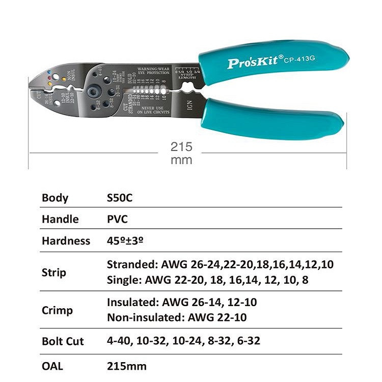 این ابزار دارای سیم چین ، پرس سرسیم ، پیچ بر و سیم لخت کن 8.5 اینچ است..