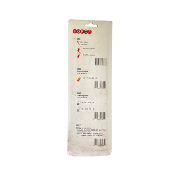کالای فوق محصولی فوق العاده از شرکت تایوانی فورس FORCE می باشد که شهرت آن در تولید با کیفیت بسیار بالا در دنیا زبان زد است. انبر پرس کابلشو مدل 6801 توانایی پرس کابل در محدوده 0.5 تا 6 میلی متر را دارا می باشد که برای استاندارد ترمینال های قرمز ، آبی و زرد طراحی شده است . تمامی محصولات فورس تحت لایسنس آلمان تولید شده و دارای استاندارد CE اروپا هستند .