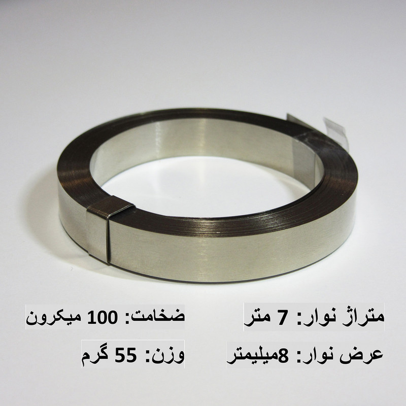 سایر توضیحات: عرض 8 میلیمتر، ضخامت 100 میکرون، طول 7 متر وزن 55 گرم به عنوان منبع نیکل برای استفاده در آبکاری مناسب نیست و برای اتصال باتری کاربرد دارد