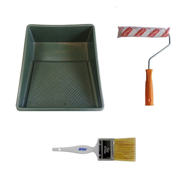 مجموعه 3 عددی وسایل نقاشی ساختمان شامل : 1 عدد سینی 5 لیتری دنیز - 1 عدد غلتک 20 سانتیمتری دنیز - 1 عدد قلم مو 2/5 اینچی (63 میلیمتر) آریا
