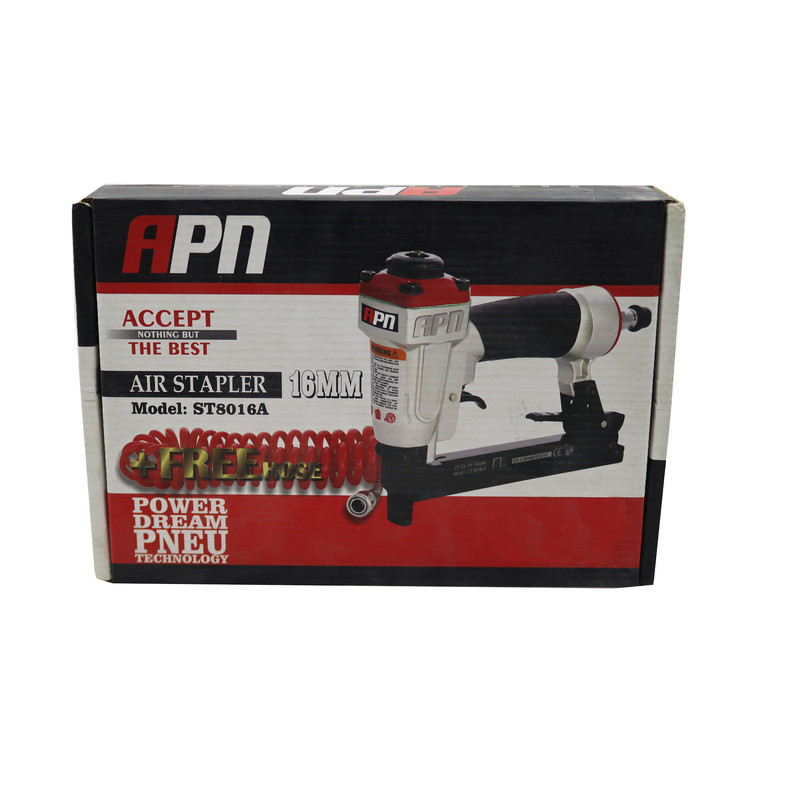 منگنه کوب بادی 16 میلی متری ای پی ان مدل APN) ST 8016 A) یکی از منگنه های ساخته شده توسط شرکت ای پی ان است. منگنه کوب بادی ای پی ان مدل APN) ST 8016 A) خوش دست و سبک است و برای راحتی استفاده کاربران، جایگذاری منگنه از پایین (کف) دستگاه انجام می شود. در منگنه مدل ST8016A هوا به صورت 360 درجه خارج می شود. مزیت این سیستم این است که هوا (باد) با فشار مساوی و یک دست بر منگنه وارد می شود و در آخر نتیجه کار تمیزتری خواهید داشت. اندازه هر یک از این منگنه ها برابر 16x12.7 میلی متر است. این منگنه کوب دارای بدنه سبک و قوی ساخته شده از جنس آلومینیوم است و دارای یک شلنگ 5 متری از جنس پلی یورتان است.