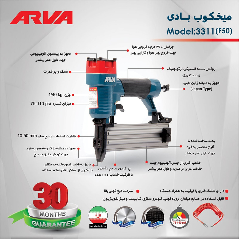 وزن1350 گرمتوان- واتسایز میخ قابل پشتیبانی20 الی 50 میلی مترظرفیت90فشار هوا60 PSIاقلام همراهشلنگ فنری دفترچه راهنمای فارسی آچار قوطی روغنابعاد24x3x23 سانتیمتر