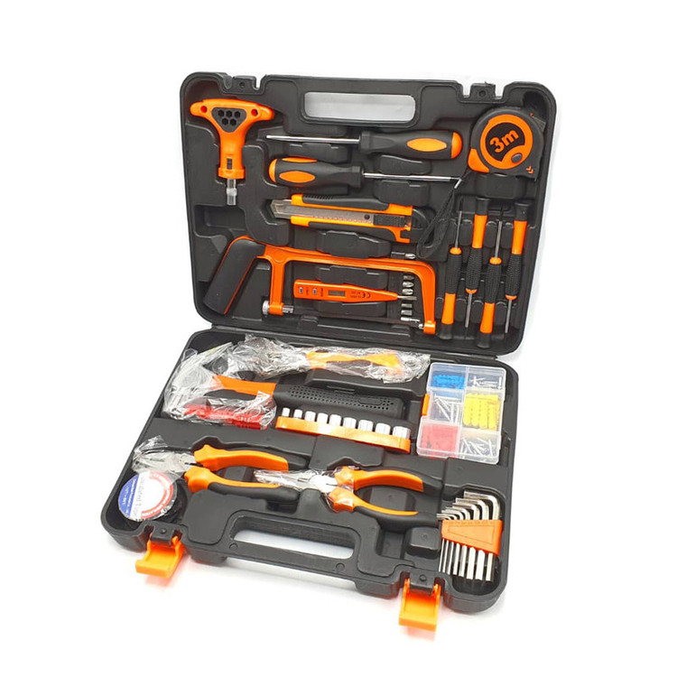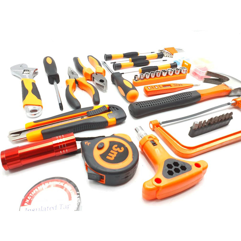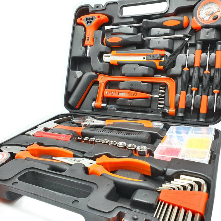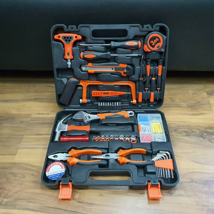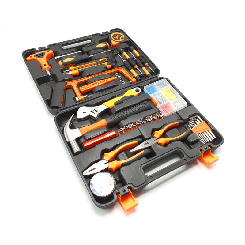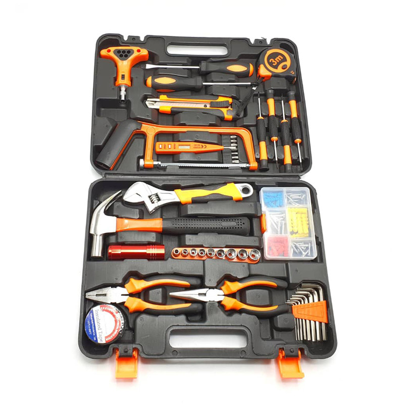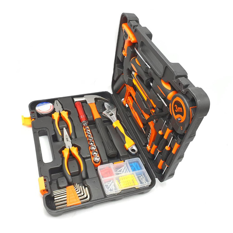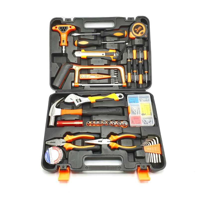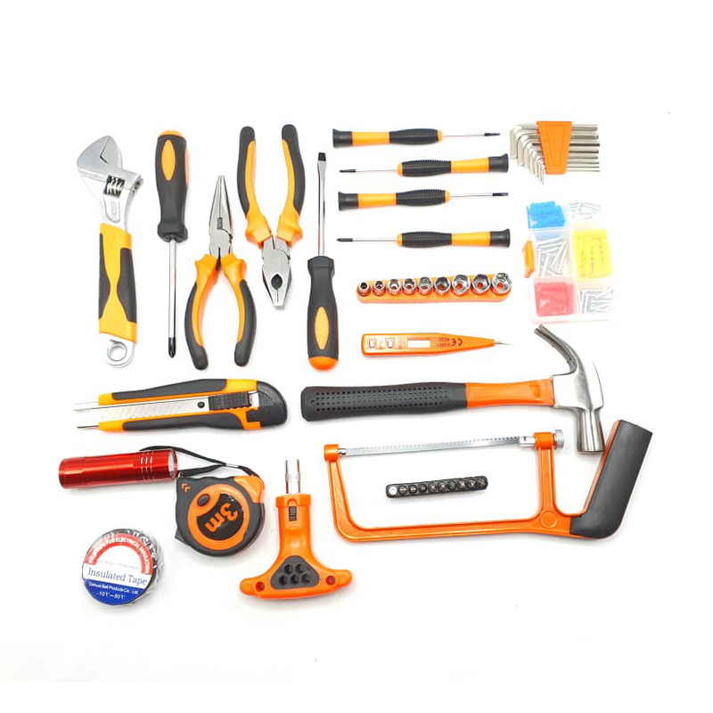 محتویات مجموعه: آچار آلن , آچار رینگی , آچار فرانسه , اره افقیبر , انبر دم باریک , انبردست , پیچ , پیچ گوشتی , تیغ کاتر , چراغ قوه , چسب , چکش , دسته جغجغهای , رولپلاک , سری بکس , سری پیچگوشتی , فازمتر , کاتر , متر