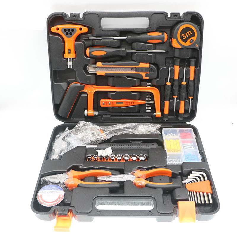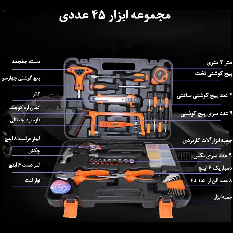 محتویات مجموعه: آچار آلن , آچار تخت , انبر دم باریک , آچار فرانسه , انبردست , پیچ گوشتی , پیچ , چکش , چسب , دسته جغجغهای , سری بکس , سری پیچگوشتی , فازمتر , کاتر , متر