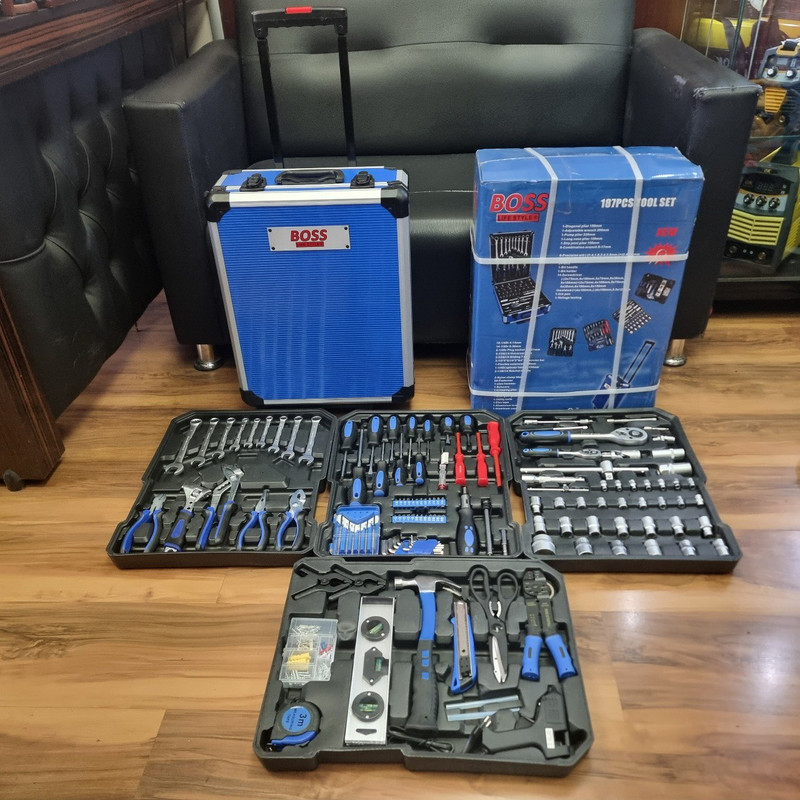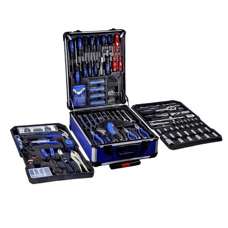محتویات مجموعه: آچار آلن , آچار بکس , آچار تخت , آچار رینگی , آچار فرانسه , آچار یکسر تخت یکسر رینگی , اره افقیبر , انبر دم باریک , انبر سیم لختکن , انبر سیمچین , انبر کلاغی , انبردست , پیچ گوشتی , تراز , چکش , دسته جغجغهای , سری بکس , سری پیچگوشتی , فازمتر , قیچی