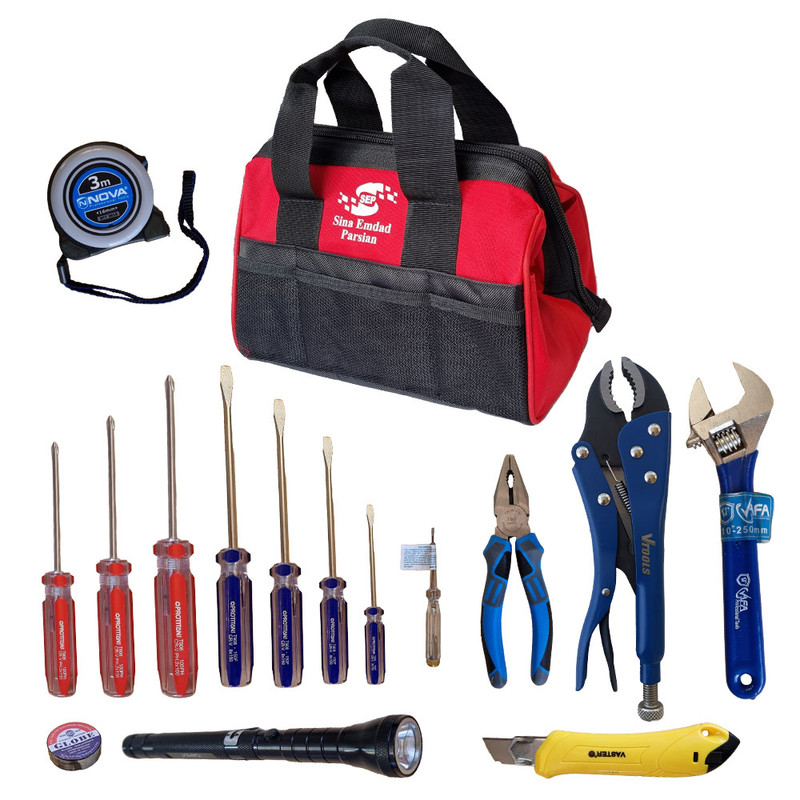 محتویات مجموعه: آچار فرانسه , انبر قفلی , انبردست , چراغ قوه , چسب , سری پیچگوشتی , فازمتر , کاتر , کیف ابزار , متر