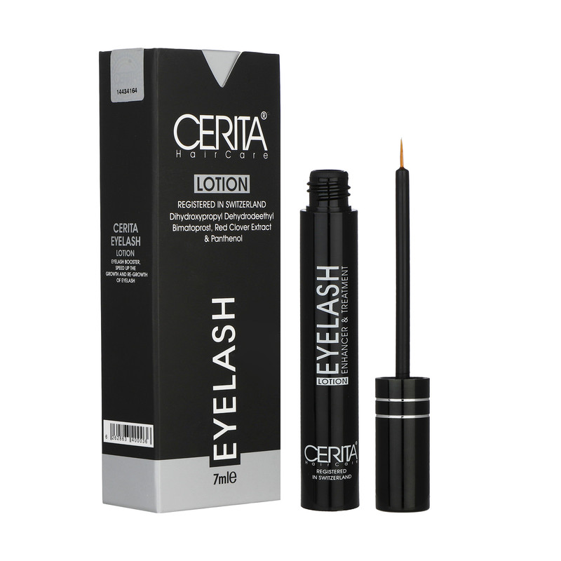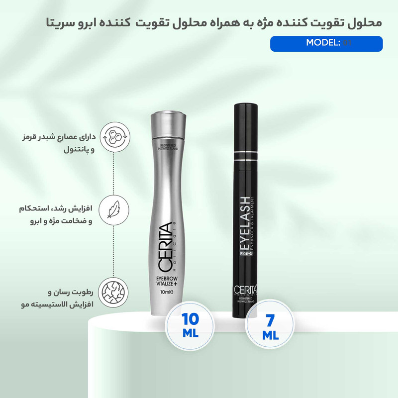 محلول تقویت کننده مژه سریتا مدل LOTION حجم 7 میلی لیتر به همراه سرم تقویت کننده ابرو سریتا مدل VITALIZE حجم 10 میلی لیتر، یکی از تخصصیترین محصولات موجود در بازار برای درمان ریزش مژه و افزایش طول، حجم و ضخامت آنها است. مژهها نقش مهمی را در محافظت از چشمان ما ایفا میکنند پس مراقبت و رسیدگی به مژهها از اهمیت بالایی برخوردار است. محلول تقویتکننده مژه سریتا بهطور اختصاصی برای مژه ساخته شده است. این محلول در افزایش رشد، استحکام و ضخامت مژهها بسیار مؤثر است. یکی از ترکیبات به کار رفته در این محصول شبدر قرمز است که با داشتن خاصیت آنتی اکسیدانی باعث مهار رادیکالهای آزاد میشود. این محصول به واسطه داشتن ویتامینهای B3 و B5 علاوه بر افزایش انرژیرسانی به تارهای مژه باعث رطوبترسانی به آنها و جلوگیری از خشکی مژه میشود. مصرف منظم این محصول از مهمترین نکات برای به دست آوردن نتیجه دلخواه است. محلول تقویت مژه سریتا باید روی مژه های تمیز و عاری از مواد آرایشی استفاده کنید. دوره مصرف محلول تقویت مژه به این صورت است که باید به مدت سه ماه هر شب یکبار بر روی مژه کشیده شود و سپس 10 روز فاصله و دوباره به مدت 3 ماه دیگر هر شب استفاده شود. از تماس محلول تقویت مژه با داخل چشم جلوگیری نمایید و بههیچعنوان زمانی که آرایش بر روی مژه قرار دارد از این محلول استفاده نکنید.