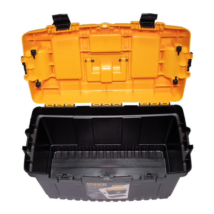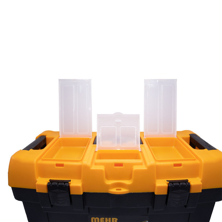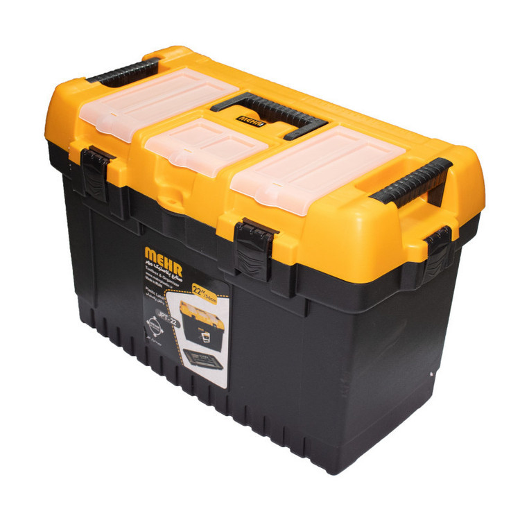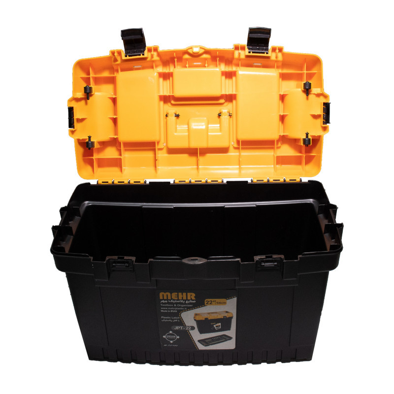 دارای 3 محفظهی در دار با عمق 3 سانت بر روی در اصلی جعبه/به همراه یک سینی دستهدار قابل حمل / سینی دارای 4 محفظه در ابعاد مختلف با عمق 4 سانتیمتر/دارای یک قسمت سوراخ دار در جلوی جعبه ابزار برای نصب قفل حلقه ای/دارای دستگیرهی تاشو و ضد لغزش