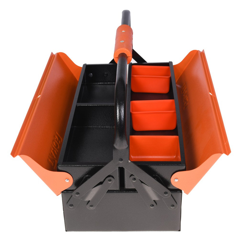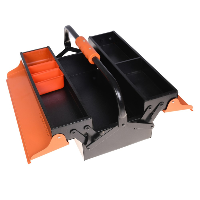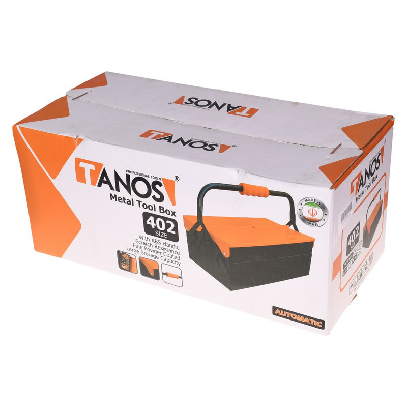 جعبه ابزار مدل 402 تانوس یک جعبه ابزار دو طبقه است که تمام بدنه اش از ورقهای فولادی باکیفیت ضد زنگ ساخته شده است.تمام سطح این جعبه با رنگ پودری ریز الکترواستاتیک کوره ای پوشانده شده است تا در برابر خش ها و خراش های احتمالی ناشی از قرار گیری ابزار و برخورد با سطوح مختلف، مقاومت خوبی از خود نشان دهد. سایز این جعبه ابزار فلزی مقاوم سایز 40 سانتی است و این به این معناست که با وجود ابعاد 15×20×40 سانتیمتری خود، از حجم داخلی مناسبی در حدود 12 لیتر برخوردار میباشد.تعداد 4 محفظه در سایزهای کوچک، متوسط و بزرگ در دو طبقهی این جعبه قرار گرفته اند. در واقع این محصول دارای دو محفظهی کوچک با ابعاد 5×10×20 سانتیمتر، یک محفظهی متوسط با ابعاد 5×10×40 سانتیمتر و یک محفظهی بزرگ با ابعاد 10×20×40 سانتیمتر است.