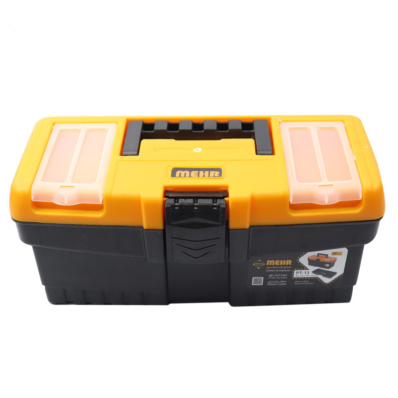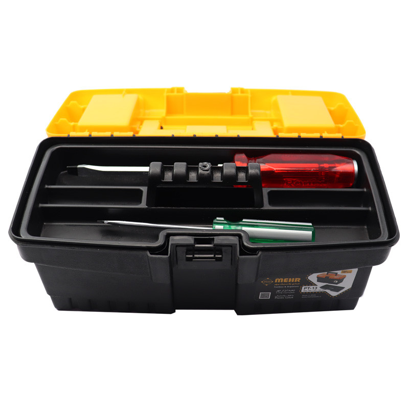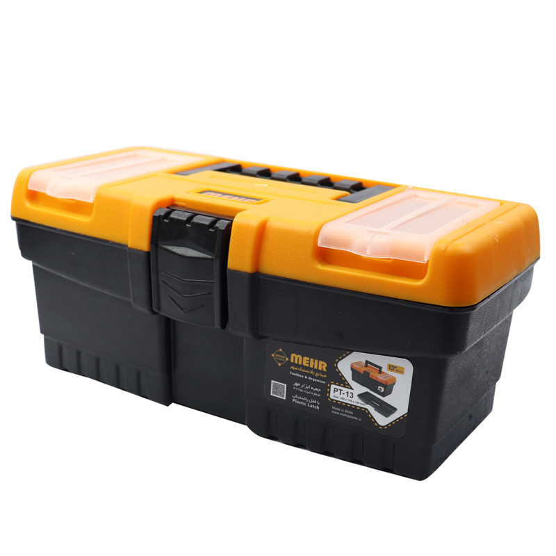 بر روی در اصلی این جعبه نیز دو محفظه با عمق 2.5 سانتیمتر پیشبینی شده که بر روی آنها دری شفاف تعبیه شده است و از آنها میتوان برای قرار دادن ابزارهای پر مصرف کوچک مثل پیچ و مهره استفاده کرد. دستگیرهی جعبه نیز حالت تاشو دارد و به شکلی طراحی شده است که در دست لیز نمیخورد و حمل این جعبه را آسان میکند.جعبه ابزار 13 اینچ مهر پلاستیک، طولی در حدود 32 سانتیمتر یا 13 اینچ دارد و عمق آن به حدود 11 سانتیمتر میرسد.