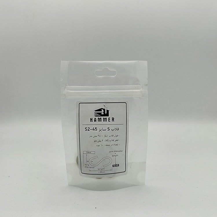 سایر توضیحات: بسته بندی زیپ دار با برند هامر مطابق تصویر ، دارای قطر استاندارد 2 میلی متر و دارای طول تقریبی 45 میلی متر ، بسته بندی 10 عددی ، شکل قلاب S ، جنس آهن آبکاری شده (( توجه : لطفا جهت خرید به مشخصات فنی ترسیم شده و ذکر شده در تصاویر توجه کنید))