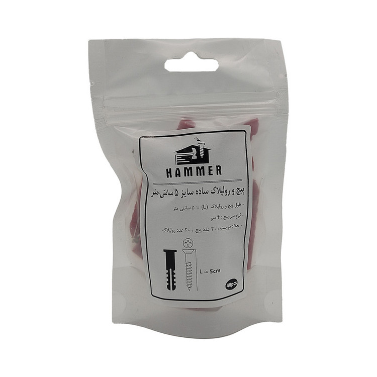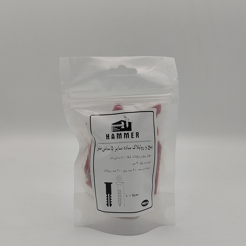 سایر توضیحات: بسته بندی زیپ دار با برند هامر مطابق تصویر ، دارای طول 5 سانتی متر ، بسته بندی 40 عددی ( 20 عدد پیچ و 20 عدد رولپلاک ) ، آبکاری طلایی (( توجه : لطفا جهت خرید به مشخصات فنی ترسیم شده و ذکر شده در تصاویر توجه کنید))