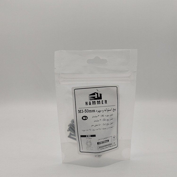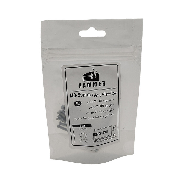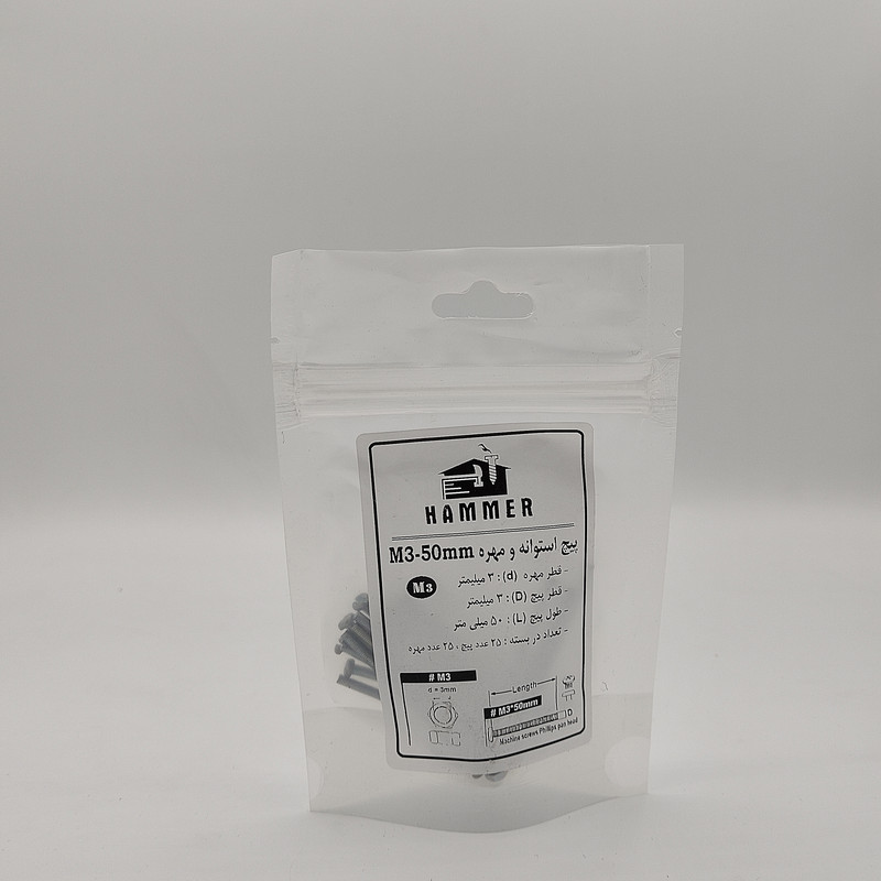 سایر توضیحات: بسته بندی زیپ دار با برند هامر مطابق تصویر ، دارای قطر استاندارد 3 میلی متر و طول پیچ استوانه 3 میلی متر ، بسته بندی 50 عددی (( توجه : لطفا جهت خرید به مشخصات فنی ترسیم شده و ذکر شده در تصاویر توجه کنید))